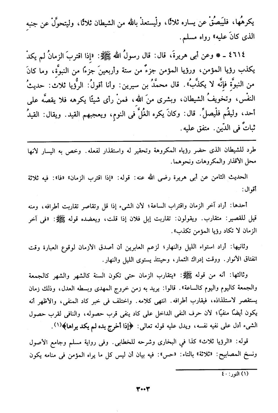 4614 - وعن أبي هريرة، قال: قال رسول الله صلى الله عليه وسلم: ((إذا اقترب الزمان لم يكد يكذب رؤيا المؤمن، ورؤيا المؤمن جزء من ستة وأربعين جزءاً من النبوة، وما كان من النبوة فإنه لا يكذب)). قال محمد بن سيرين: وأنا أقول: الرؤيا ثلاث: حديث النفس، وتخويف الشيطان، وبشرى من الله، فمن رأي شيئاً يكرهه فلا يقصه على أحد، وليقم فليصل. قال: وكان يكره الغل في النوم، ويعجبهم القيد. ويقال: القيد ثبات في الدين. متفق عليه.