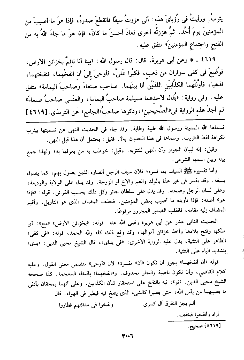 4619 - وعن أبي هريرة، قال: قال رسول الله: ((بينا أنا نائم بخزائن الأرض، فوضع في كفي سواران من ذهب، فكبرا على، فأوحى إلى أن انفخهما، فنفختهما، فذهبا، فأولتهما الكذابين اللذين أنا بينهما: صاحب صنعاء وصاحب اليمامة)) متفق عليه. وفي رواية: ((يقال لأحدهما مسيلمة صاحب اليمامة، والعنسى صاحب صنعاء)) لم أجد هذه الرواية في ((الصحيحين))، وذكرها صاحب ((الجامع)) عن الترمذي. [4619]