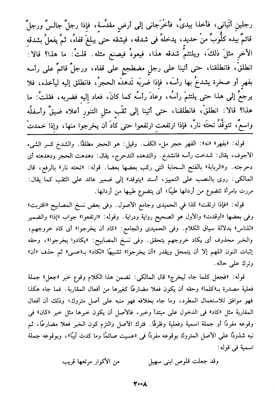 رجلين أتياني، فأخذا بيدي، فأخرجاني إلى أرض مقدسة، فإذا رجل جالس ورجل قائم بيده كلوب من حديد، يدخله في شدقه، فيشقه حتى يبلغ قفاه، ثم يفعل بشدقه الآخر مثل ذلك، ويلتئم شدقه هذا، فيعود فيصنع مثله. قلت: ما هذا؟ قالا: انطلق، فانطلقنا، حتى أتينا على رجل مضطجع على قفاه، ورجل قائم على رأسه بفهر أو صخرة يشدخ بها رأسه، فإذا ضربه تدهده الحجر، فانطلق إليه ليأخذه، فلا يرجع إلى هذا حتى يلتئم رأسه، وعاد رأسه كما كان، فعاد إليه فضربه، فقلت: ما هذا؟ قالا: انطلق، فانطلقنا، حتى أتينا إلى ثقب مثل التنور أعلاه ضيق وأسفه واسع، تتوقد تحته نار، فإذا ارتفعت ارتفعوا حتى كاد أن يخرجوا منها، وإذا خمدت