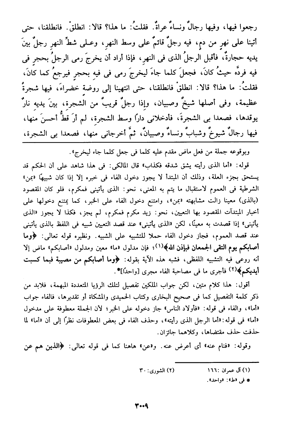 قوله: ((أما الذي رأيته يشق شدقه فكذاب)) قال المالكي: في هذا شاهد على أن الحكم قد يستحق بجزء العلة، وذلك أن المبتدأ لا يجوز دخول الفاء في خبرة إلا إذا كان شبيهاً ((بمن)) الشرطية في العموم لاستقبال ما يتم به المعنى، نحو: الذي يأتيني فمكرم، فلو كان المقصود (بالذي) معينا زالت مشابهته ((بمن))، وامتنع دخول الفاء على الخبر، كما يمتنع دخولها على أخبار المبتدآت المقصود بها التعيين، نحو: زيد مكرم فمكرم، لم يجز/ فكذا لا يجوز ((الذي يأتيني)) إذا قصدت به معيناً، لكن ((الذي يأتيني)) عند قصد التعيين شبيه في اللفظ بالذي يأتيني عند قصد العموم، فجاز دخول الفاء حملا للتشبيه على الشبيه. ونظيره قوله تعالى: {وما أصابكم يوم التقى الجمعان فبإذن الله}؛ فإن مدلول ((ما)) معين ومدلول ((أصابكم)) ماض إلا أنه روعى فيه التشبيه اللفظي، فشبه هذه الآية بقوله: {وما أصابكم من مصيبة فبما كسبت أيديكم} فأجرى ما في مصاحبه الفاء مجرى [واحداً].