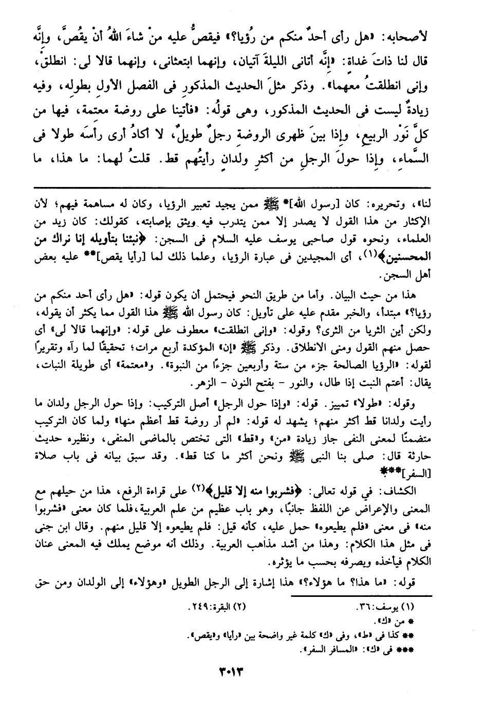 هذا من حيث البيان. وأما من طريق النحو فيحتمل أن يكون قوله: ((هل رأي أحد منكم من رؤيا؟)) مبتدأ، والخبر مقدم عليه على تأويل: كان رسول الله صلى الله عليه وسلم هذا القول مما يكثر أن يقوله، ولكن أين الثريا من الثرى؟ وقوله: ((وإني انطلقت)) معطوف على قوله: ((وإنما قالا لى)) أي حصل منهم القول ومني الانطلاق. وذكر صلى الله عليه وسلم ((إن)) المؤكدة أربع مرات؛ تحقيقاً لما رآه وتقريراً لقوله: ((الرؤيا الصالحة جزء من ستة وأربعين جزءاً من النبوة)). و ((معتمة)) أي طويلة النبات، يقال: أعتم النبت إذا طال، والنور- بفتح النون- الزهر.