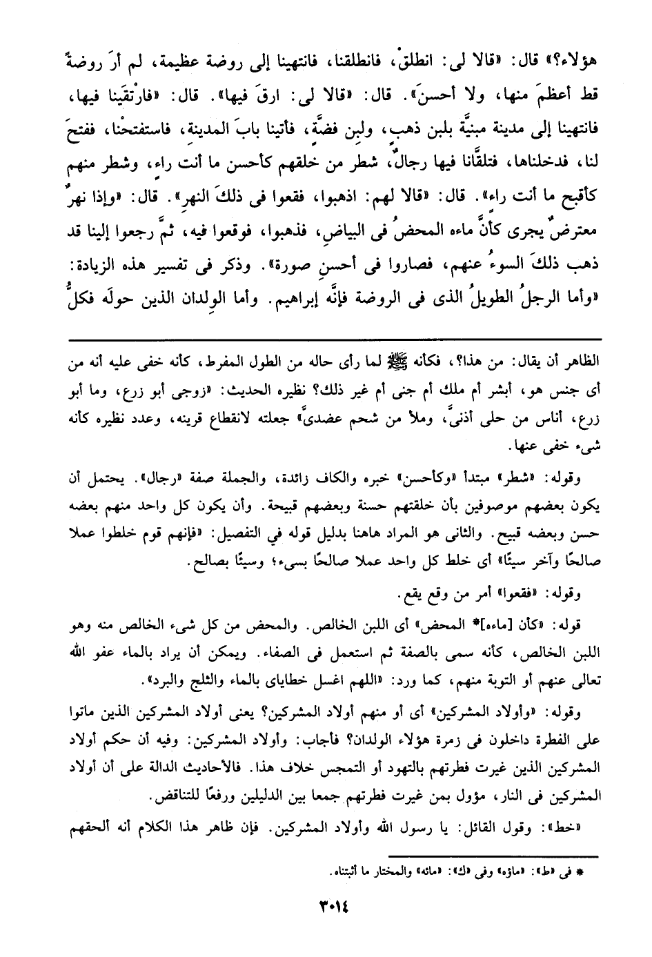 هؤلاء؟)) قال: ((قالا لي: انطلق، فانطلقنا، فانتيهنا إلى روضة عظيمة، لم أر روضة قط أعظم منها، ولا أحسن)). قال: ((قالا لي: ارق فيها)). قال: ((فارتقينا فيها، فانتهينا إلى مدينة مبنية بلبن ذهب، ولبن فضة، فأتينا باب المدينة، فاستفتحنا، ففتح لنا، فدخلناها، فتلقانا فيها رجال، شطر من خلقهم كأحسن ما أنت راء، وشطر منهم كأقبح ما أنت راء)). قال: ((قالا لهم: اذهبوا، فقعوا في ذلك النهر)). قال: ((وإذا نهر معترض يجرى كأن ماءه المحض في البياض، فذهبوا، فوقعوا فيه، ثم رجعوا إلينا قد ذهب ذلك السوء عنهم، فصاروا في أحسن صورة)). وذكر في تفسير هذه الزيادة: ((وأما الرجل الطويل الذي في الروضة فإنه إبراهيم. وأما الولدان الذين حوله فكل