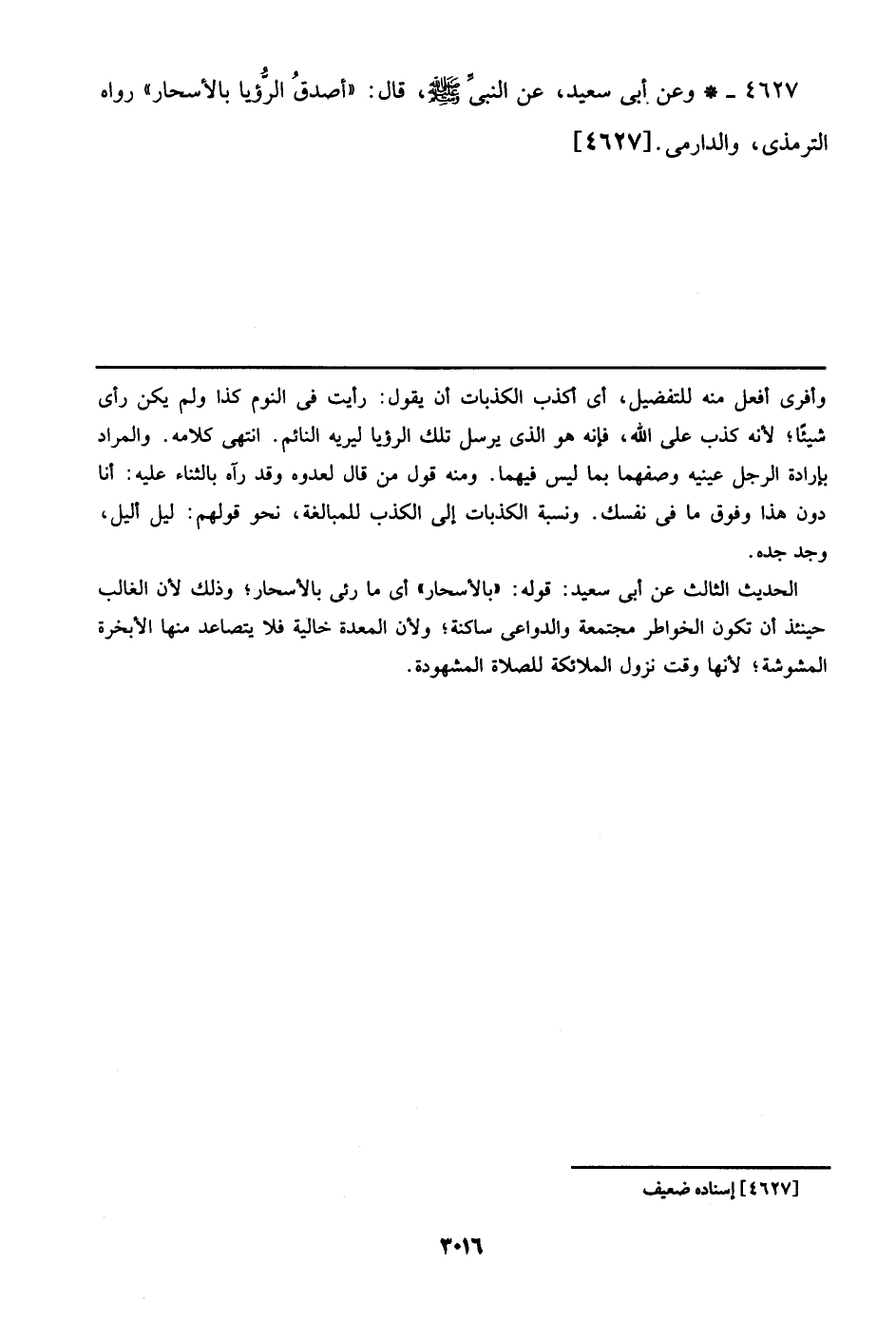 4627 - وعن أبي سعيد، عن النبي صلى الله عليه وسلم، قال: ((أصدق الرؤيا بالأسحار)) رواه الترمذي، والدارمي. [4627]