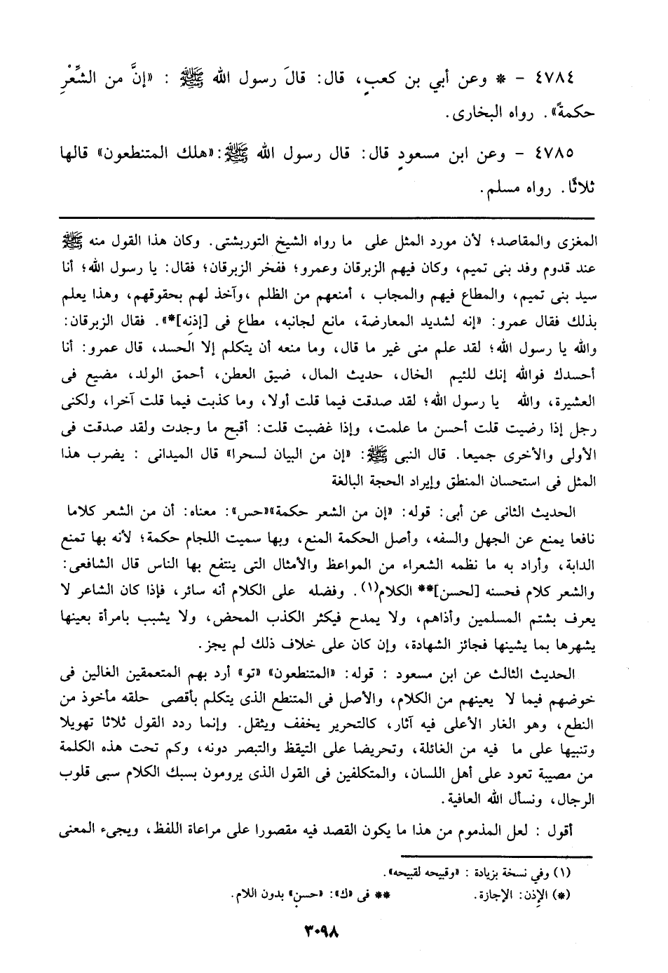 المغزى والمقاصد؛ لأن مورد المثل على ما رواه الشيخ التوربشتي. وكان هذا القول منه صلى الله عليه وسلم عند قدوم وفد بني تميم، وكان فيهم الزبرقان وعمرو؛ ففخر الزبرقان؛ فقال: يا رسول الله! أنا سيد بني تميم، والمطاع فيهم والمجاب، أمنعهم من الظلم، وآخذ لهم بحقوقهم، وهذا يعلم بذلك فقال عمرو: ((إنه لشديد المعارضة، مانع لجانبه، مطاع في ((إذنه)))).فقال الزبرقان: والله يا رسول الله؛ لقد علم مني غير ما قال، وما منعه أن يتكلم إلا الحسد، قال عمرو: أنا أحسدك فوالله إنك للئيم الخال، حديث المال، ضيق العطن، أحمق الولد، مضيع في العشيرة، والله يا رسول الله؛ لقد صدقت فيما قلت أولا، وما كذبت فيما قلت آخرا، ولكني رجل إذا رضيت قلت أحسن ما علمت، وإذا غضبت: قلت أقبح ما وجدت ولقد صدقت في الأولى والأخرى جميعا. قال النبي صلى الله عليه وسلم: ((إن من البيان لسحرا)) قال الميداني: يضرب هذا المثل في استحسان المنطق وإيراد الحجة البالغة.