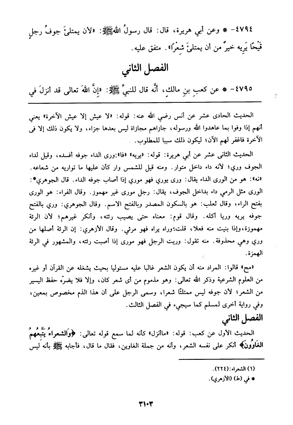 4794 - وعن أبي هريرة، قال: قال رسول الله صلى الله عليه: ((لأن يمتلئ جوف رجل قيحا يريه خير من أن يمتلئ شعرا)).متفق عليه.