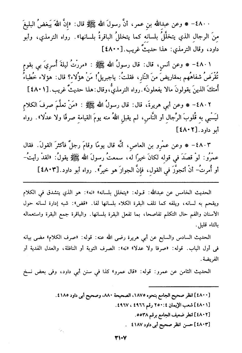 4800 - وعن عبد الله بن عمر، أن رسول الله صلى الله عليه وسلم قال: ((إن الله يبغض البليغ من الرجال الذي يتخلل بلسانه كما يتخلل الباقرة بلسانها)) رواه الترمذي، وأبو داود. وقال الترمذي: هذا حديث غريب. [4800]