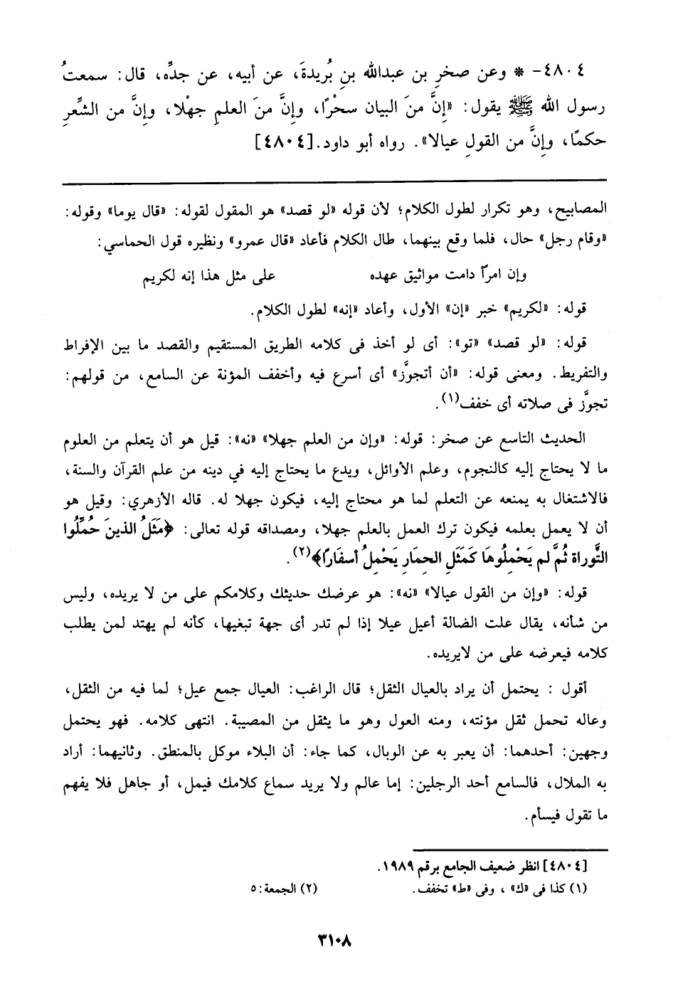 4804 - عن صخر بن عبد الله بن بريدة، عن أبيه، عن جده، قال: سمعت رسول الله صلى الله عليه وسلم يقول: ((إن من البيان سحرا، وإن من العلم جهلا، وإن من الشعر حكما، وإن من القول عيالا)).رواه أبو داود. [4804]