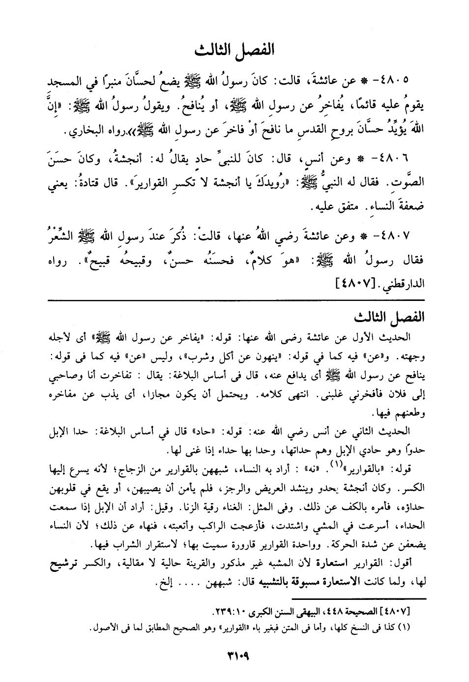قوله: ((بالقوارير)) ((نه)): أراد به النساء، شبههن بالقوارير من الزجاج؛ لأنه يسرع إليها الكسر. وكان أنجشة يحدو وينشد العريض والرجز، فلم يأمن أن يصيبهن، أو يقع في قلوبهن حداؤه، فأمره بالكف عن ذلك. وفي المثل: الغناء رقية الزنا. وقيل: أراد أن الإبل إذا سمعت الحداء، أسرعت في المشي واشتدت، فأزعجت الراكب وأتعبته، فنهاه عن ذلك؛ لأن النساء يضعفن عن شدة الحركة. وواحدة القوارير قارورة سميت بها؛ لاستقرار الشراب فيها.