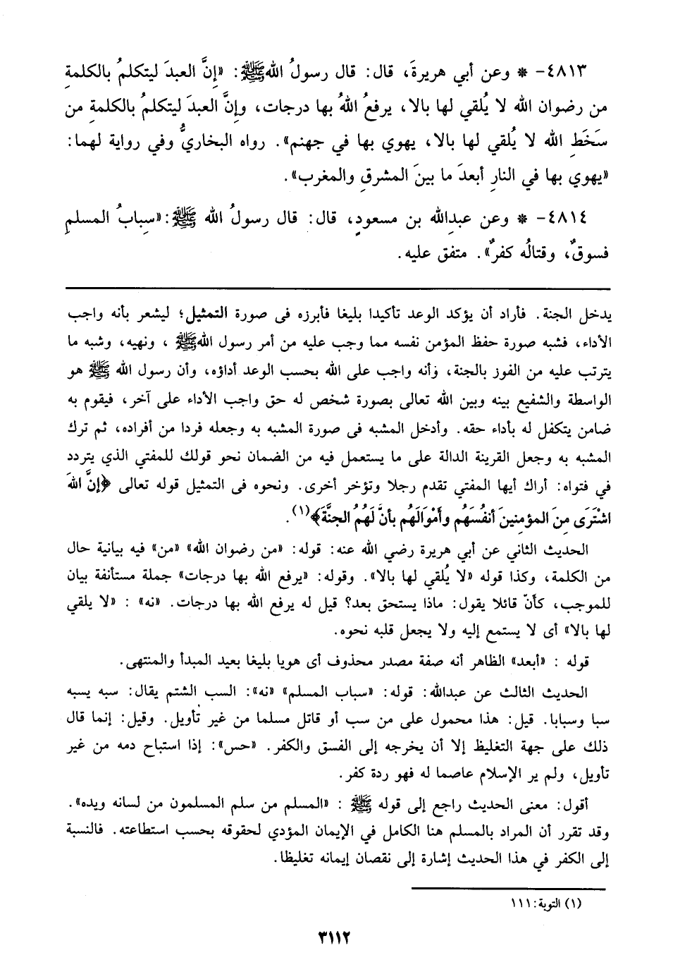 4813 - وعن أبي هريرة، قال: قال رسول الله صلى الله عليه وسلم: ((إن العبد ليتكلم بالكلمة من رضوان الله لا يلقي لها بالا، يرفع الله بها درجات، وإن العبد ليتكلم بالكلمة من سخط الله لا يلقي لها بالا، يهوى بها في جهنم)).رواه البخاري وفي رواية لهما: ((يهوي بها في النار أبعد مابين المشرق والمغرب)).