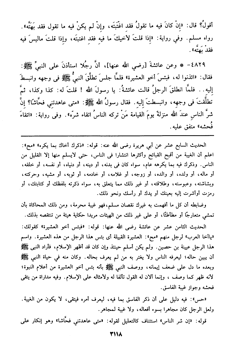 الحديث الثامن عشر عن عائشة رضي الله عنها: قوله: ((فبئس أخو العشيرة)) كقولك: ((يا أخا العرب)) لرجل منهم ((مح)):العشيرة القبيلة أي بئس هذا الرجل من هذه العشيرة، واسم هذا الرجل عيينة بن حصين. ولم يكن أسلم حينئذ وإن كان قد أظهر الإسلام، فأراد النبي صلى الله عليه وسلم أن يبين حاله؛ ليعرفه الناس ولا يغتر به من لم يعرف بحاله. وكان منه في حياة النبي صلى الله عليه وسلم وبعده ما دل على ضعف إيمانه، ووصف النبي صلى الله عليه وسلم بأنه بئس أخو العشيرة من أعلام النبوة؛ لأنه ظهر كما وصف، وإنما ألان له القول تألفا له ولأمثاله على الإسلام. وفيه مدارة من يتقي فحشه وجواز غيبة الفاسق.