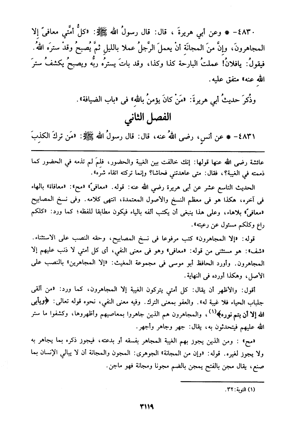 أقول: والأظهر أن يقال: كل أمتي يتركون الغيبة إلا المجاهرون، كما ورد: ((من ألقى جلباب الحياء فلا غيبة له)).والعفو بمنع الترك. وفيه معنى الترك. وفيه معنى النفي، نحوه قوله تعالى:} ويأبى الله إلا أن يتمم نوره {،والمجاهرون هم الذين جاهروا بمعاصيهم وأظهروها، وكشفوا ما ستر الله عليهم فيتحدثون به، يقال: جهر وجاهر وأجهر.