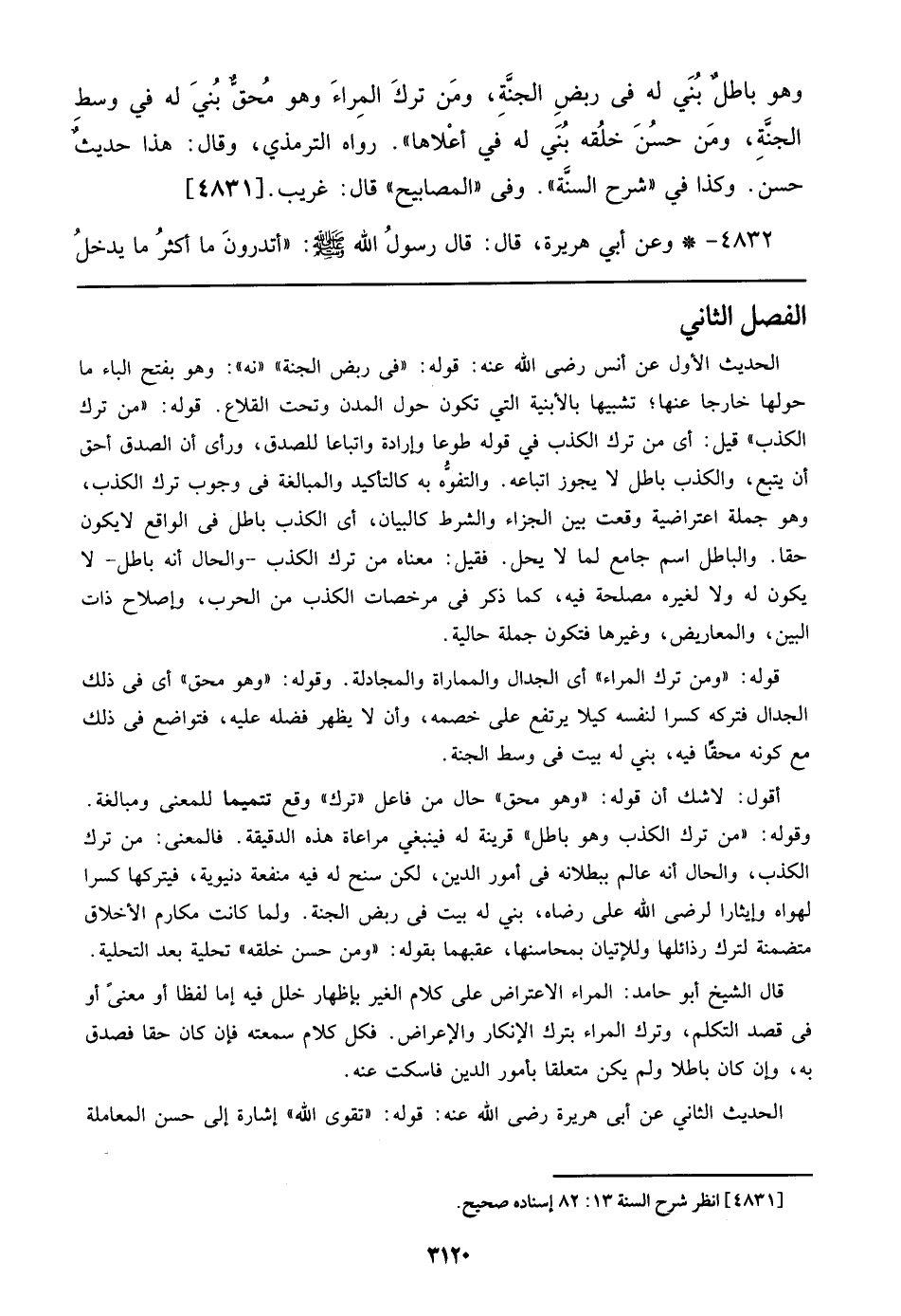 الحديث الأول عن أنس رضي الله عنه: قوله: ((في ربض الجنة)) ((نه)):وهو بفتح الباء ما حولها خارجا عنها؛ تشبيها بالأبنية التي تكون حول المدن وتحت القلاع. قوله: ((من ترك الكذب)) قيل: أي من ترك الكذب في قوله طوعا وإرادة واتباع للصدق، ورأي أن الصدق أحق أن يتبع، والكذب باطل لا يجوز اتباعه. والتفوه به كالتأكيد والمبالغة في وجوب ترك الكذب، وهو جملة اعتراضية وقعت بين الجزاء والشرط كالبيان، أي الكذب باطل في الواقع لا يكون حقا. والباطل اسم جامع لما لا يحل. فقيل: معناه من ترك الكذب- والحال أنه باطل- لا يكون له ولا لغيره مصلحة فيه، كما ذكر في مرخصات الكذب من الحرب، وإصلاح ذات البين، والمعاريض، وغيرها فتكون جملة حالية.