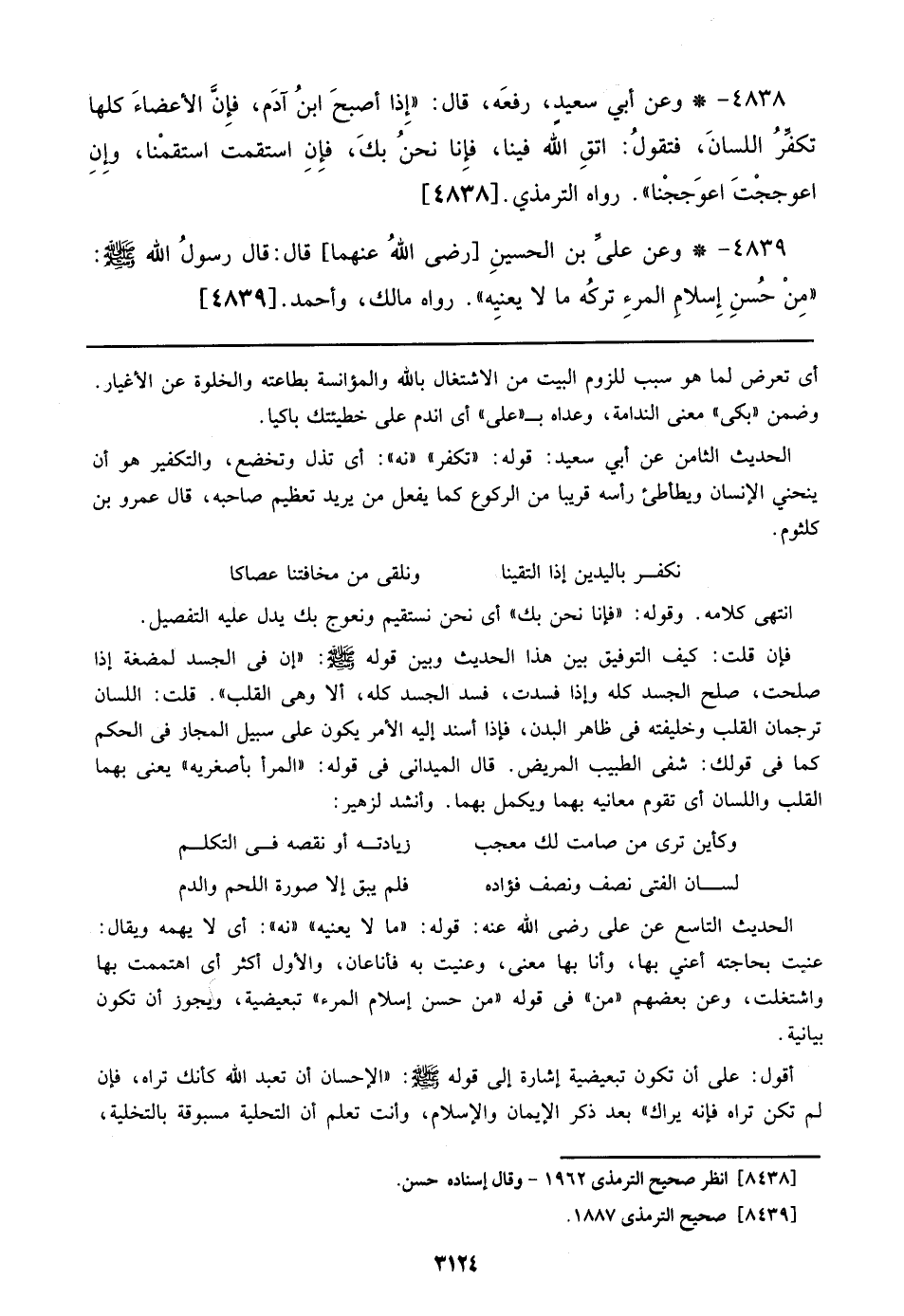4838 - وعن أبي سعيد، رفعه، قال: ((إذا أصبح ابن آدم، فإن الأعضاء كلها تكفر اللسان، فتقول: اتق الله فينا، فإنا نحن بك، فإن استقمت اسقمنا، وإن اعوججت اعوججنا)) رواه الترمذي. [4838]