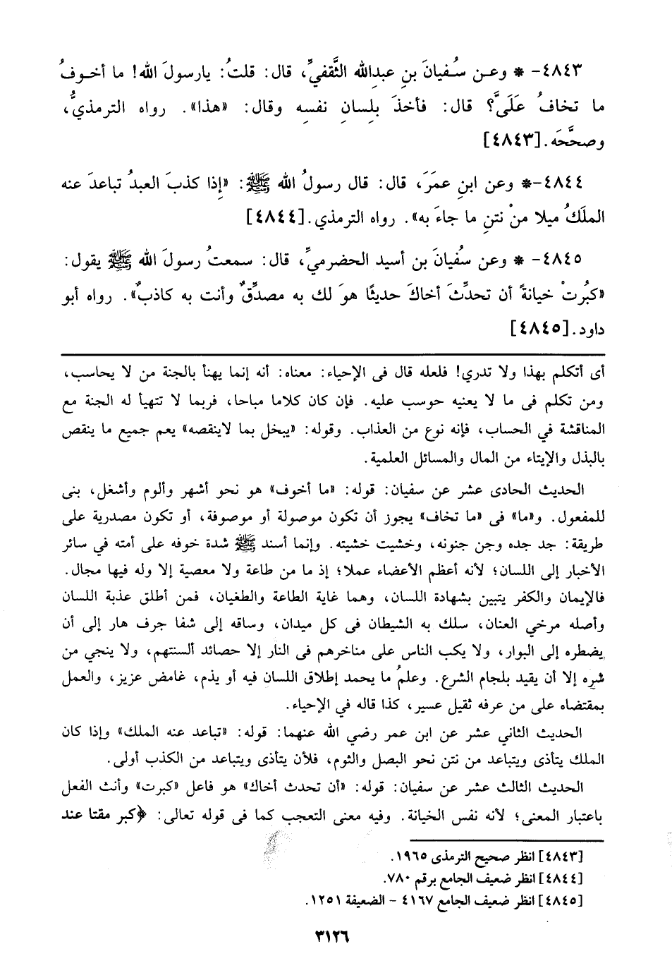 4843 - وعن سفيان بن عبد الله الثقفي، قال: قلت يا رسول الله! ما أخوف ما تخاف علي؟ قال: فأخذ بلسان نفسه وقال: ((هذا)).رواه الترمذي، وصححه. [4843]