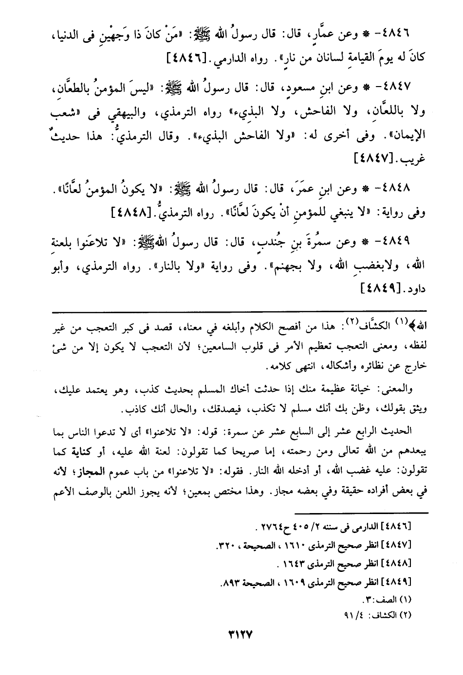 4848 - وعن ابن عمر، قال: قال رسول الله صلى الله عليه وسلم: ((لا يكون المؤمن لعانا)).وفي رواية: ((لا ينبغي للمؤمن أن يكون لعانا)).رواه الترمذي. [4848]