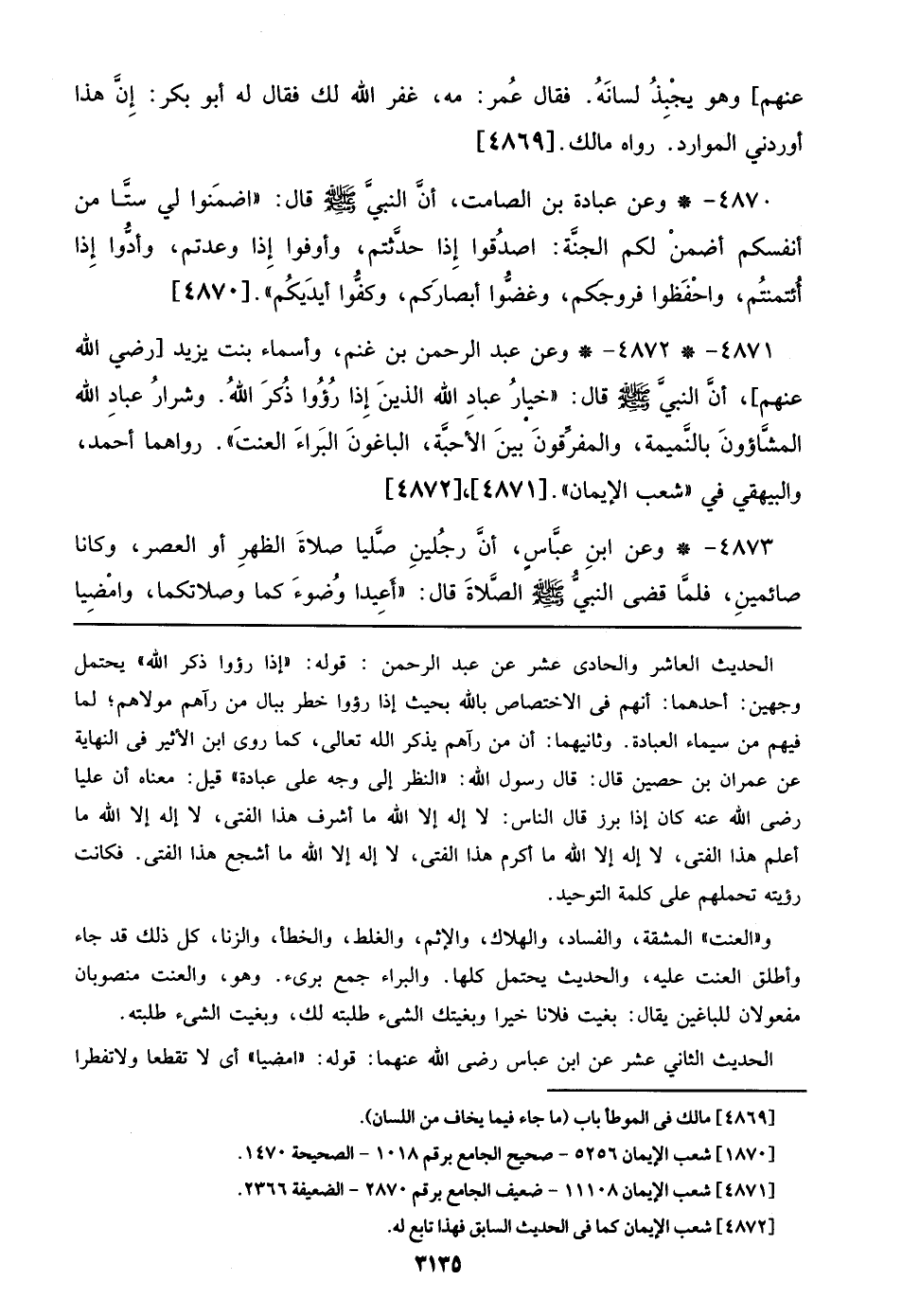 4871 - 4872 - وعن عبد الرحمن بن غنم، وأسماء بنت زيد ((رضي الله عنهم))،أن النبي صلى الله عليه وسلم قال: ((خيار عباد الله الذين إذا رؤوا ذكر الله. وشرار عباد الله المشاؤون بالنميمة، والمفرقون بين الأحبة، الباغون البراء العنت)). رواهما أحمد، والبيهقي في ((شعب الإيمان)). [4871]، [4872]
