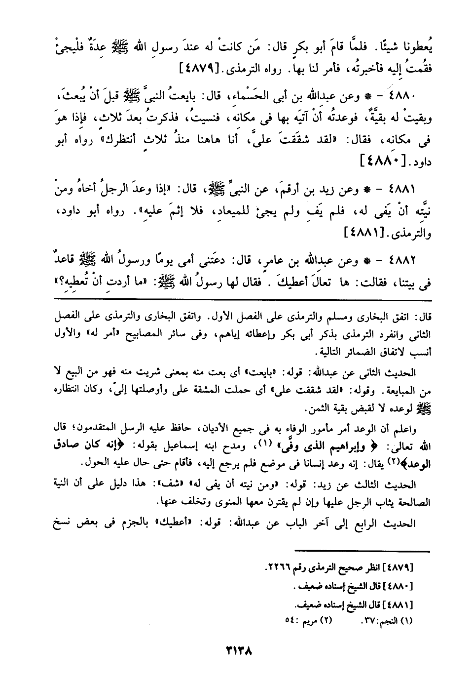 4881 - وعن زيد بن أرقم، عن النبي صلى الله عليه وسلم، قال: ((إذا وعد الرجل أخاه ومن نيته أن يفي له، فلم يف ولم يجئ للميعاد، فلا إثم عليه)).رواه أبو داود، والترمذي. [4881]
