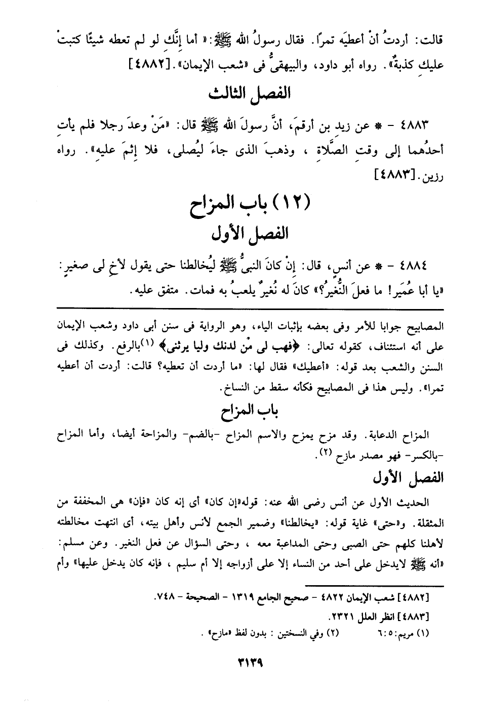 4884 - عن أنس، قال: إن كان النبي صلى الله عليه وسلم ليخالطنا حتى يقول لأخ لي صغير: ((يا أبا عمير! ما فعل النغير؟)) كان له نغير يلعب به فمات. متفق عليه.