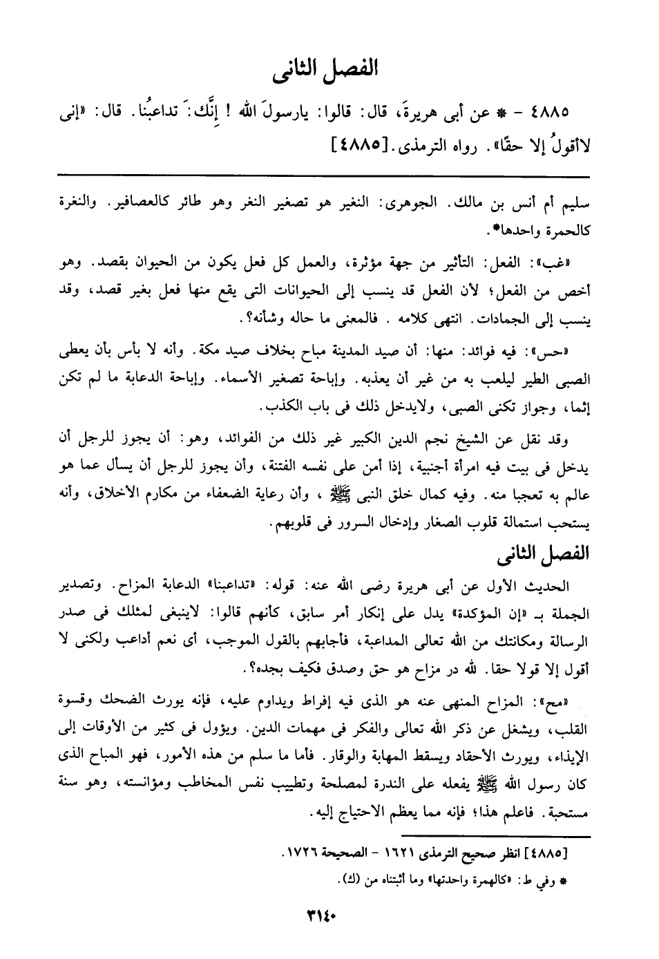((مح)):المزاح المنهي عنه هو الذي فيه إفراط ويداوم عليه، فإنه يورث الضحك وقسوة القلب، ويشغل عن ذكر الله تعالى والفكر في مهمات الدين. ويؤول في كثير من الأوقات إلى الإيذاء، ويورث الأحقاد ويسقط المهابة والوقار. فأما من سلم من هذه الأمور، فهو المباح الذي كان رسول الله صلى الله عليه وسلم يفعله على الندرة لمصلحة وتطييب نفس المخاطب ومؤانسته، وهو سنة مستحبة. فاعلم هذا؛ فإنه مما يعظم الاحتياج إليه.