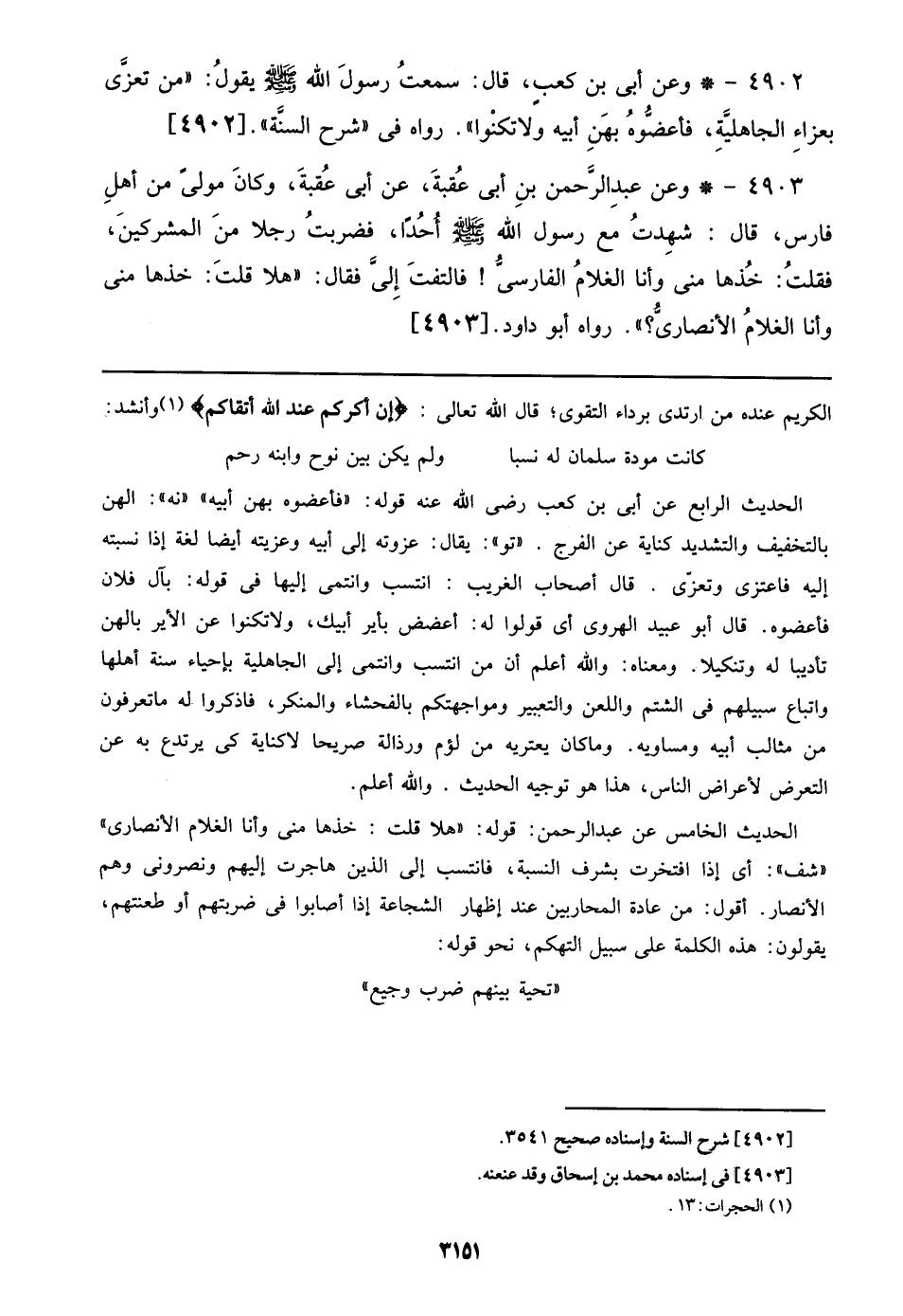 الحديث الرابع عن أبي بن كعب رضي الله عنه قوله: ((فأعضوه بهن أبيه)) ((نه)): الهن بالتخفيف والتشديد كناية عن الفرج. ((تو)): يقال: عزوته إلى أبيه وعزيته أيضاً لغة إذا نسبته إليه فاعتزى وتعزى. قال أصحاب الغريب: انتسب وانتمى إليها في قوله: بآل فلان فأعضوه. قال أبو عبيد الهروي أي قولوا له: أعضض بأير أبيك، ولا تكنوا عن الأير بالهن تأديباً له وتنكيلا. ومعناه: والله أعلم أن من انتسب وانتمى إلى الجاهلية بإحياء سنة أهلها وإتباع سبيلهم في لاشتم واللعن والتعبير ومواجهتكم بالفحشاء والمنكر، فاذكروا له ما تعرفون من مثالب أبيه ومساويه. وما كان يعتريه من لؤم ورذالة صريحاً لا كناية كي يرتدع به عن التعرض لأعراض الناس، هذا هو توجيه الحديث. والله أعلم.