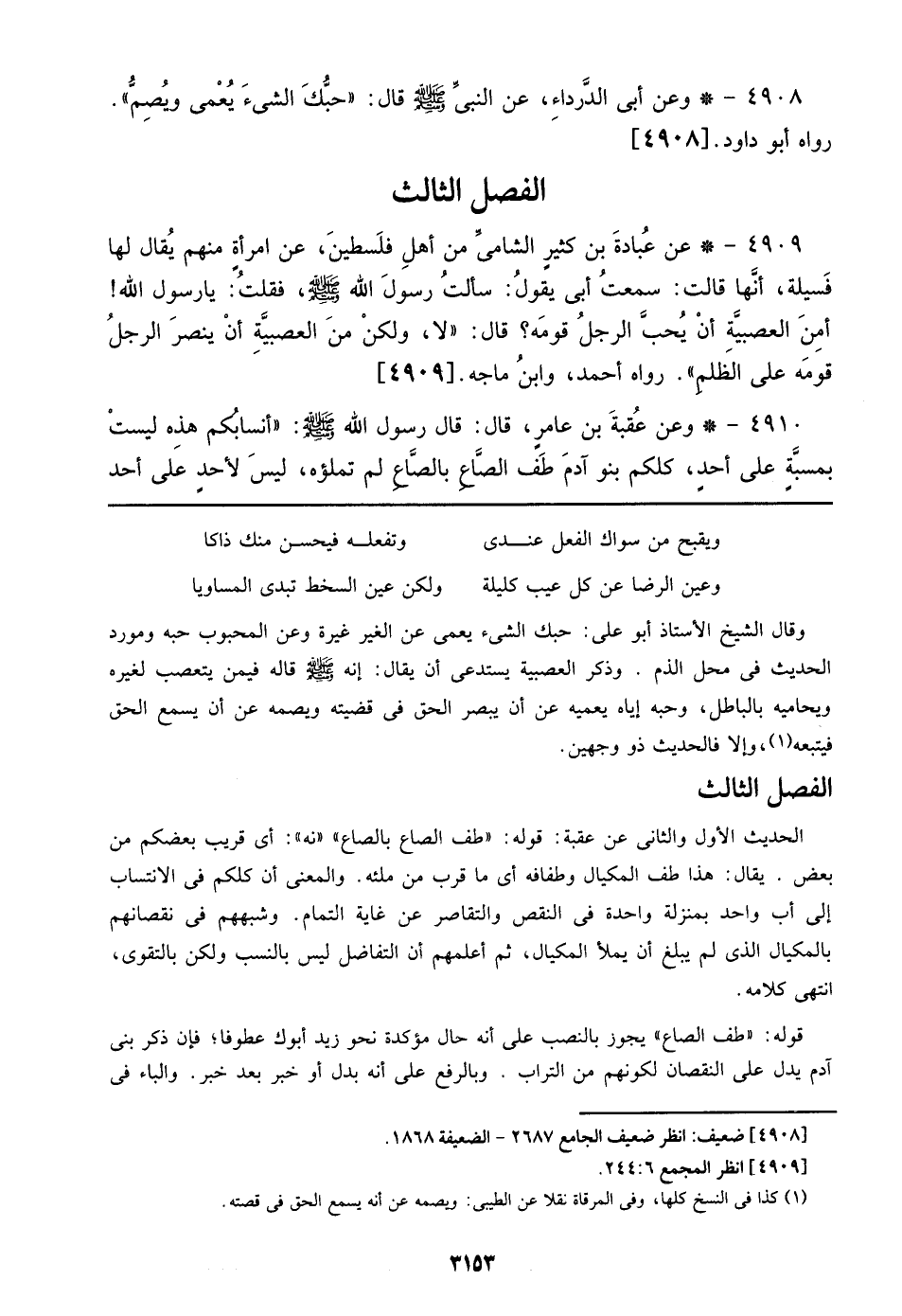 الحديث الأول والثاني عن عقبة: قوله: ((طف الصاع بالصاع)) ((نه)): أي قريب بعضكم من بعض. يقال: هذا طف المكيال وطفافه أي ما قرب من ملئه. والمعنى أن كلكم في الانتساب إلى أب واحد بمنزلة واحدة في النقص والتقاصر عن غاية التمام. وشبههم في نقصانهم بالمكيال الذي يبلغ أن يملأ بالمكيال، ثم أعلمهم أن التفاضل ليس بالنسب ولكن بالتقوى، انتهى كلامه.