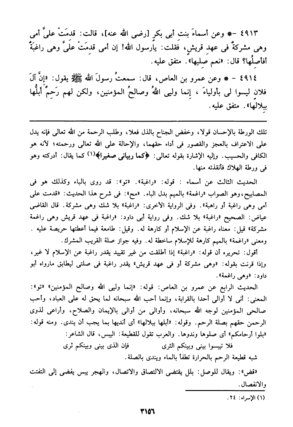 4913 - وعن أسماء بنت أبي بكر [رضي الله عنه]، قالت: قدمت على أمي وهي مشركة في عهد قريش، فقلت: يا رسول الله! إن أمي قدمت علي وهي راغبة أفأصلها. قال: ((نعم صليها)). متفق عليه.