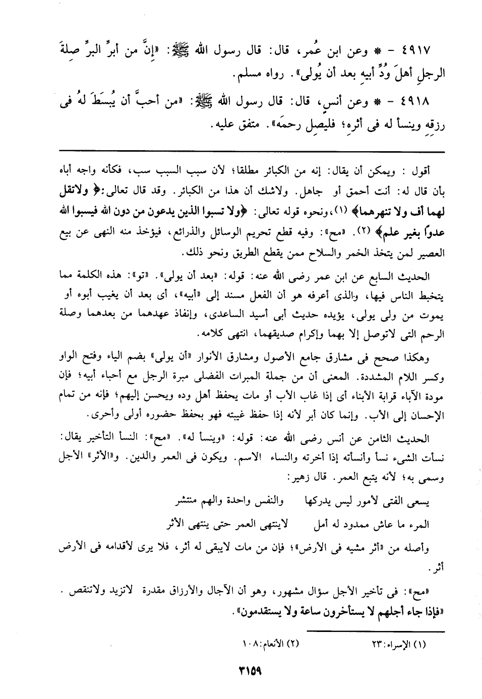 الحديث السابع عن ابن عمر رضي الله عنه: قوله: ((بعد أن يولي)). ((تو)): هذه الكلمة مما يتخبط الناس فيها، والذي أعرفه هو أن الفعل مسند إلى ((أبيه))، أي بعد أن يغيب أبوه أو يموت من ولى يولى، يؤيده حديث أبي أسيد الساعدي، وإنفاذ عهدهما من بعدهما وصلة الرحم التي لا توصل إلا بهما وإكرام صديقهما، انتهى كلامه.
