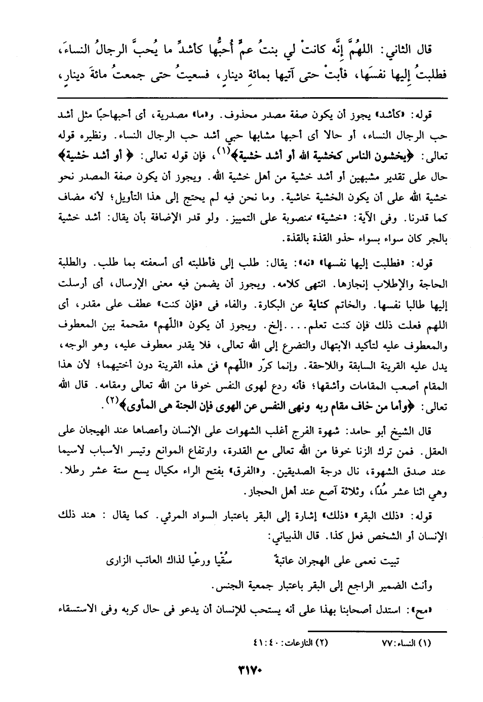 قوله: ((فطلبت إليها نفسها)) ((نه)): يقال: طلب إلي فأطلبته أي أسعفته بما طلب. والطلبة الحاجة والإطلاب إنجازها. انتهى كلامه. ويجوز أن يضمن فيه معنى الإرسال، أي أرسلت إليها طالباً نفسها. والخاتم كناية عن البكارة. والفاء في ((فإن كنت)) عطف على مقدر، أي اللهم فعلت فإن كنت تعلم .... إلخ. ويجوز أن يكون ((اللهم)) مقحمة بين المعطوف والمعطوف عليه لتأكيد الابتهال والتضرع إلى الله تعالى، فلا يقدر معطوف عليه وهو الوجه، يدل عليه القرينة السابقة واللاحقة. وإنما كرر ((اللهم)) في هذه القرينة دون أختيهما؛ لأن هذا المقام أصعب المقامات وأشقها؛ فأنه ردع لهوى النفس خوفاً من الله تعالى ومقامه. قال الله تعالى: {وأما من خاف مقام ربه ونهى النفس عن الهوى فإن الجنة هي المأوى}.