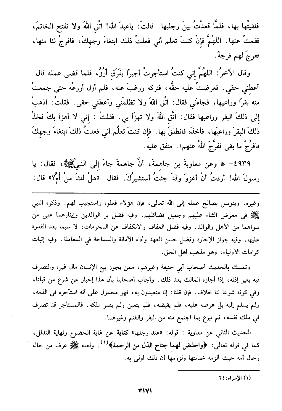 4939 - وعن معاوية بن جاهمة، أن جاهمة جاء إلى النبي صلى الله عليه وسلم، فقال: يا رسول الله! أردت أن أغزو وقد جئت أستشيرك. فقال: ((هل لك من أم؟)) قال: