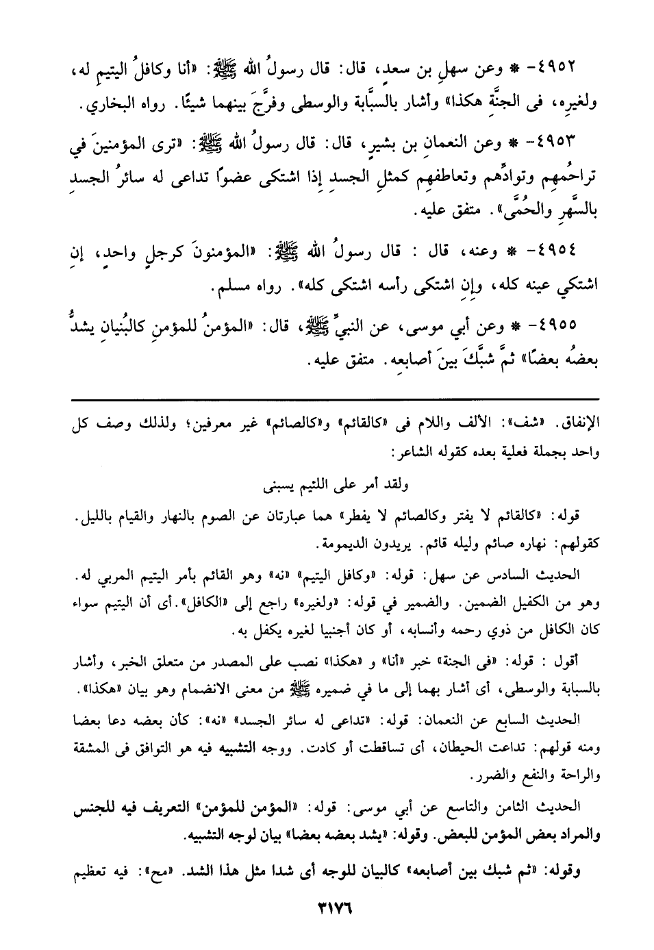 الحديث الثامن والتاسع عن أبي موسى: قوله: ((المؤمن للمؤمن)) التعريف فيه للجنس والمراد بعض المؤمن للبعض. وقوله: ((يشد بعضه بعضاً)) بيان لوجه التشبيه.