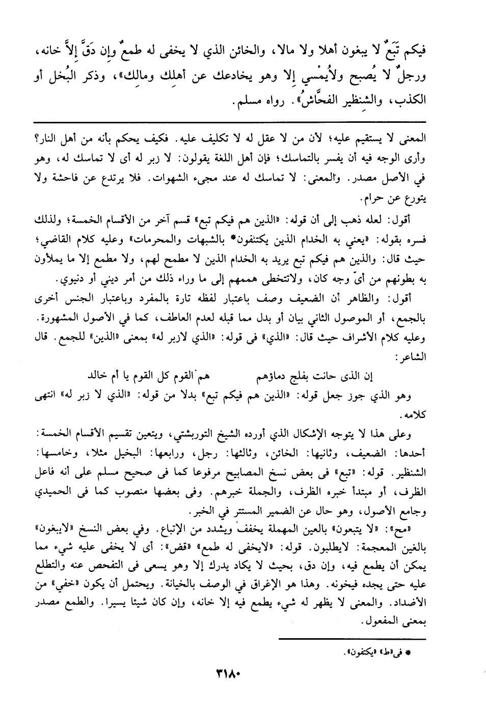 أقول: لعله ذهب إلى أن قوله: ((الذين هم فيكم تبع)) قسم آخر من الأقسام الخمسة؛ ولذلك فسره بقوله: ((يعني به الخدام الذين يكتنفون بالشبهات والمحرمات)) وعليه كلام القاضي؛ حيث قال: والذين هم فيكم تبع يريد به الخدام الذين لا مطمح لهم، ولا مطمع إلا ما يملأون به بطونهم من أي وجه كان، ولا تتخطى هممهم إلى ما وراء ذلك من أمر ديني أو دنيوي.
