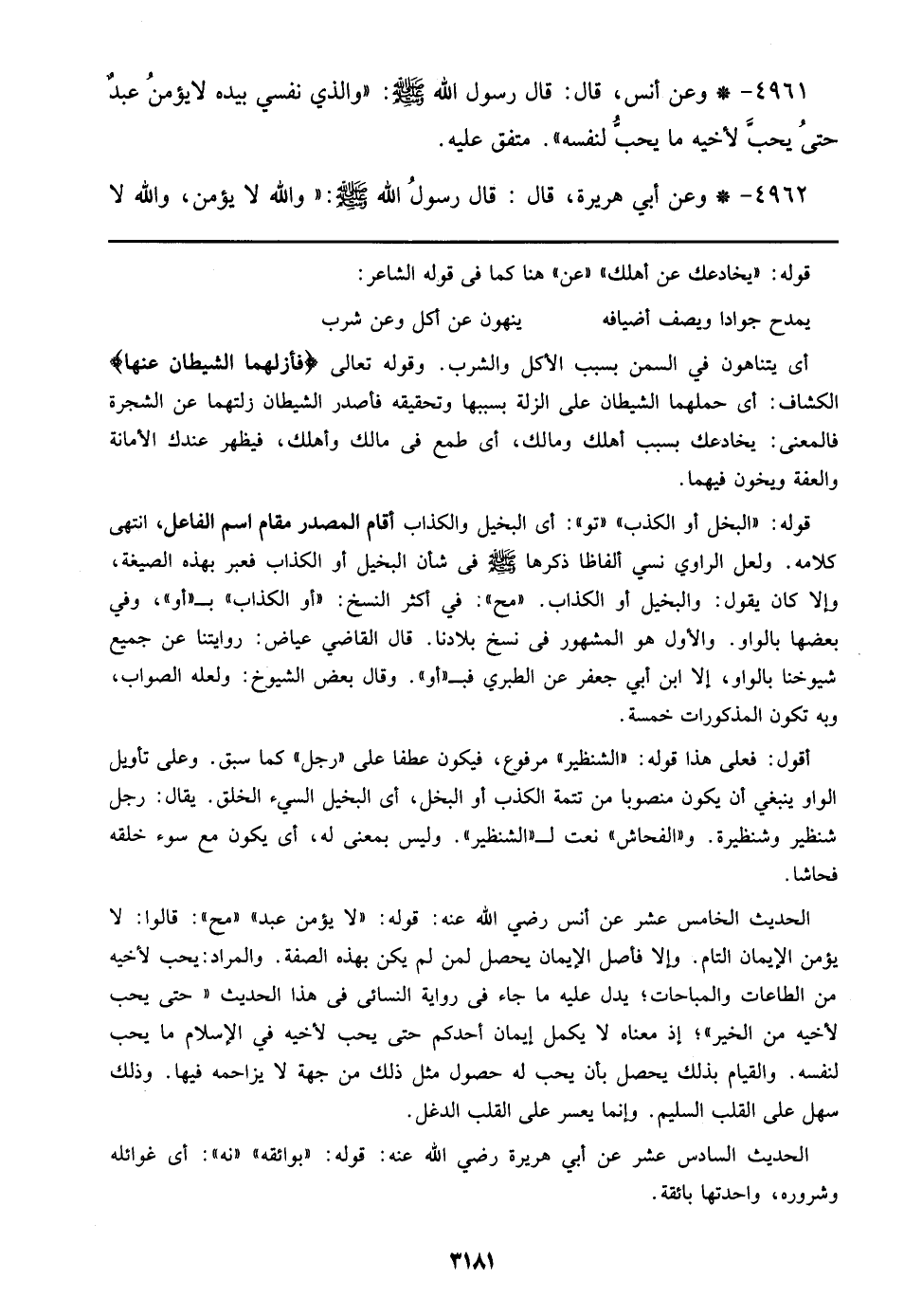 الحديث الخامس عشر عن أنس رضي الله عنه: قوله: ((لا يؤمن عبد)) ((مح)): قالوا: لا يؤمن الإيمان التام. وإلا فأصل الإيمان يحصل لمن لم يكن بهذه الصفة. والمراد: يحب لأخيه من الطاعات والمباحات؛ يدل عليه ما جاء في رواية النسائي في هذا الحديث ((حتى يحب لأخيه من الخير))؛ إذ معناه لا يكمل إيمان أحدكم حتى يحب لأخيه في الإسلام ما يحب لنفسه. والقيام بذلك يحصل بأن يحب له حصول مثل ذلك من جهة لا يزاحمه فيها. وذلك سهل على القلب السليم. وإنما يعسر على القلب الدغل.