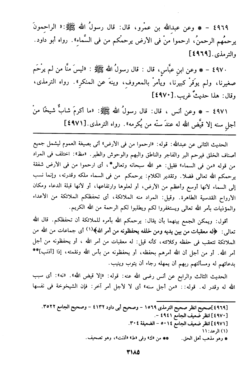 4969 - وعن عبد الله بن عمرو، قال: قال رسول الله صلى الله عليه وسلم: ((الراحمون يرحمهم الرحمن، ارحموا من في الأرض يرحمكم من في السماء)). رواه أبو داود. والترمذي. [4969]