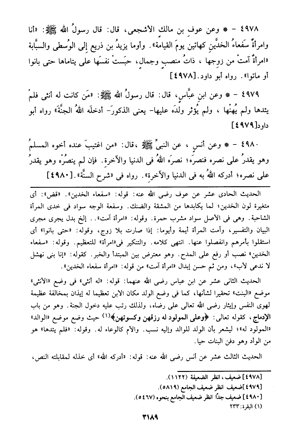 الحديث الحادي عشر عن عوف رضي الله عنه: قوله: ((سعفاء الخدين)). ((قض)): أي متغيرة لون الخدين؛ لما يكابدها من المشقة والضنك. وسفعة الوجه سواد في خدي المرأة الشاحبة. وهي في الأصل سواد مشرب حمرة. وقوله: ((امرأة آمت)) .. إلخ بدل يجري مجرى البيان والتفسير، وآمت المرأة أيمة وأيوما: إذا صارت بلا زوج، وقوله: ((حتى بانوا)) أي استقلوا بأمرهم وانفصلوا عنها. انتهى كلامه. والتنكير في ((امرأة)) للتعظيم. وقوله: ((سفعاء الخدين)) نصب أو رفع على المدح. وهو معترض بين المبتدأ والخبر. كقوله: ((إن بني نهشل لا ندعى لأب))، ومن ثم حسن إبدال ((امرأة آمت)) من قوله: ((امرأة سفعاء الخدين)).
