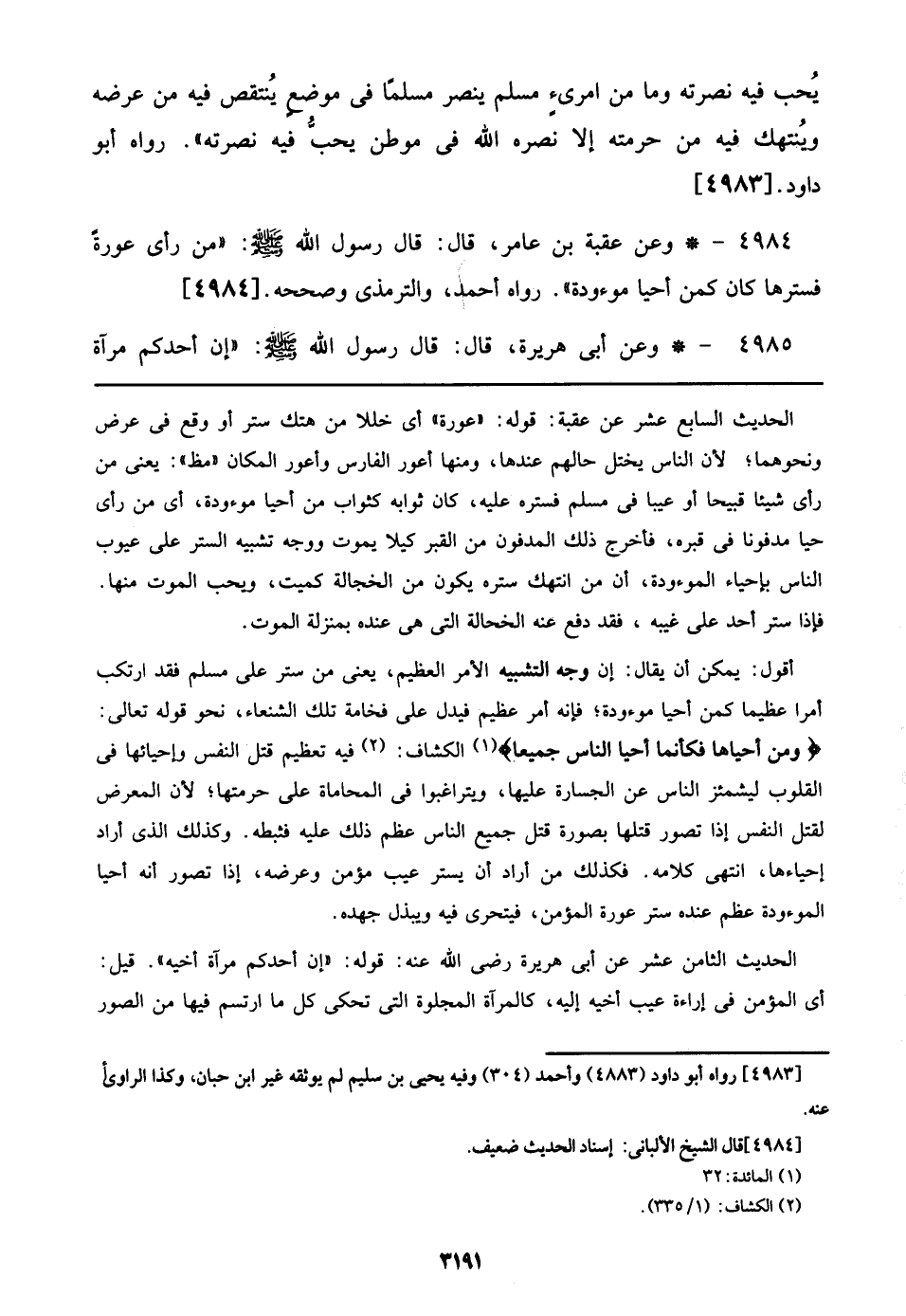 4984 - وعن عقبة بن عامر، قال: قال رسول الله صلى الله عليه وسلم: ((من رأي عورة فسترها كان كمن أحيا موءودة)). رواه أحمد، والترمذي وصححه. [4984]
