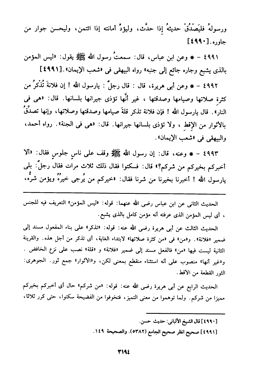 4991 - وعن ابن عباس، قال: سمعت رسول الله صلى الله عليه وسلم يقول: ((ليس المؤمن بالذي يشبع وجاره جائع إلى جنبه)) رواه البيهقي في ((شعب الإيمان)). [4991]