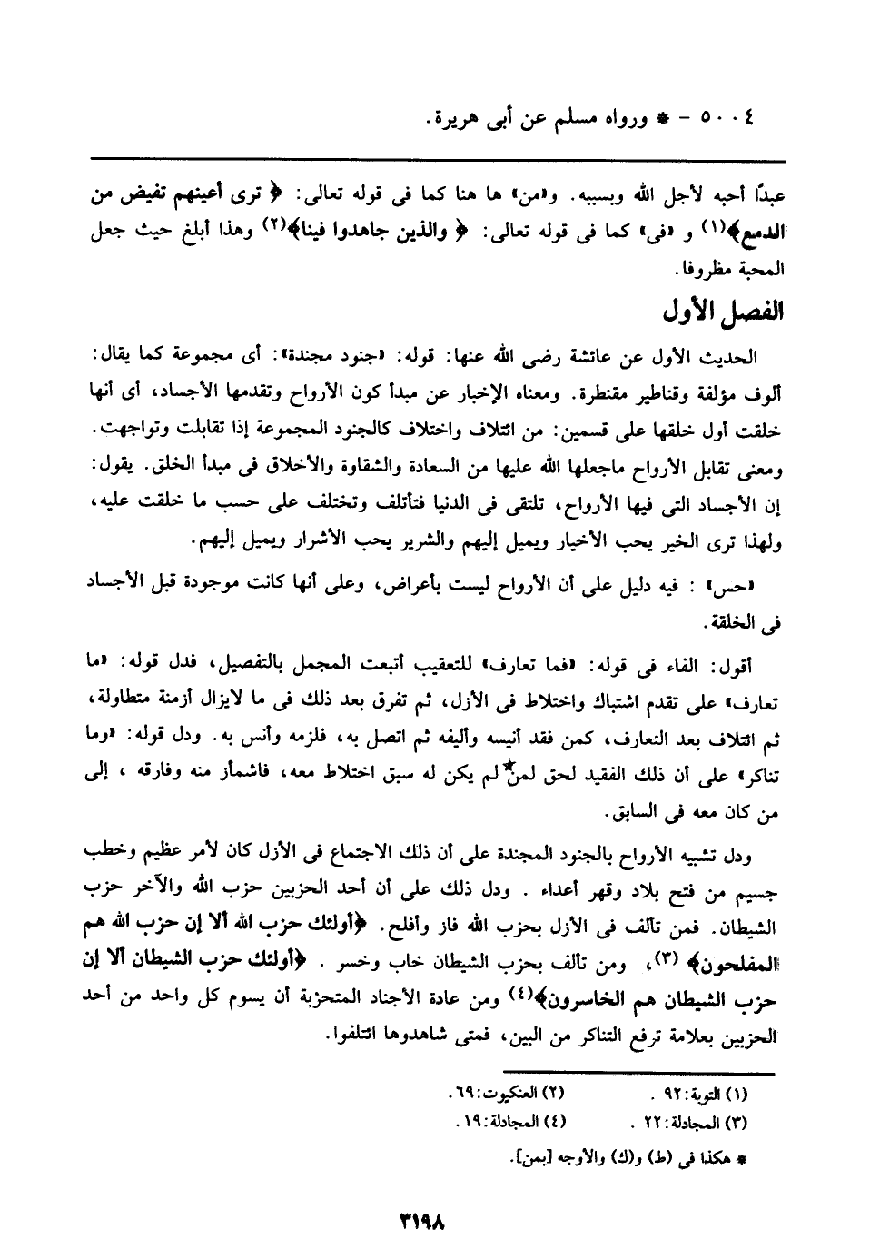الحديث الأول عن عائشة رضي الله عنها: قوله: ((جنود مجندة)): أي مجموعة كما يقال: ألوف مؤلفة وقناطير مقنطرة. ومعناه الإخبار عن مبدأ كون الأرواح وتقدمها الأجساد، أي أنها خلقت أول خلقها على قسمين: من ائتلاف واختلاف كالجنود المجموعة إذا تقابلت وتواجهت. ومعنى تقابل الأرواح ما جعلها الله عليها من السعادة والشقاوة والأخلاق في مبدأ الخلق. يقول: إن الأجساد التي فيها الأرواح، تلتقي في الدنيا فتأتلف وتختلف على حسب ما خلقت عليه، ولهذا ترى الخير يحب الأخيار ويميل إليهم والشرير يحب الأشرار ويميل إليهم.