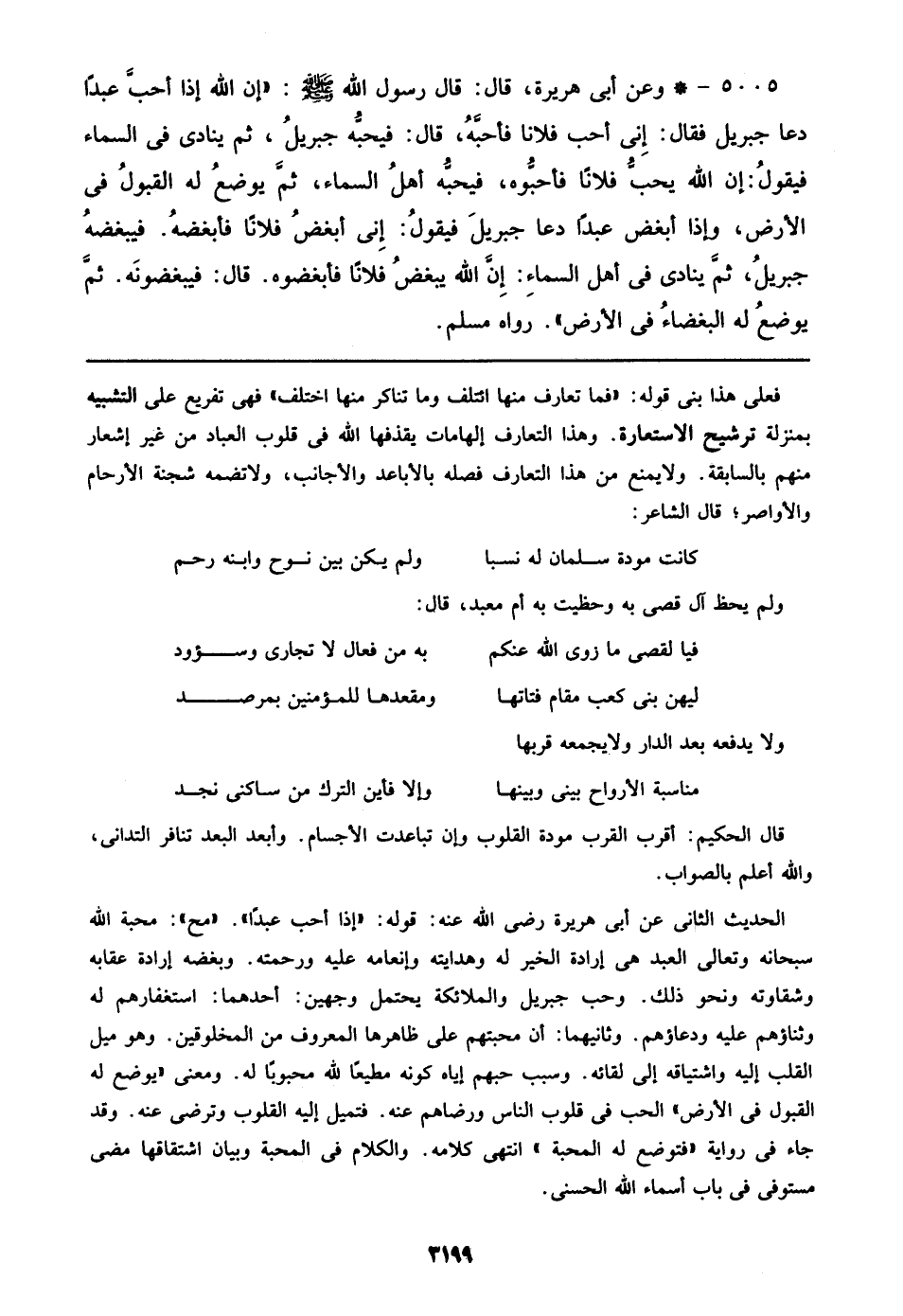 الحديث الثاني عن أبي هريرة رضي الله عنه: قوله: ((إذا أحب عبداً)). ((مح)): محبة الله سبحانه وتعالى العبد هي إرادة الخير له وهدايته وإنعامه عليه ورحمته. وبغضه إرادة عقابه وشقاوته ونحو ذلك. وحب جبريل والملائكة يحتمل وجهين: أحدهما: استغفارهم له وثناؤهم عليه ودعاؤهم. وثانيهما: أن محبتهم على ظاهرها المعروف من المخلوقين. وهو ميل القلب إليه واشتياقه إلى لقائه. وسبب حبهم إياه كونه مطيعاً لله محبوباً له. ومعنى ((يوضع له القبول في الأرض)) الحب في قلوب الناس ورضاهم عنه. فتميل إليه القلوب وترضى عنه. وقد جاء في رواية ((فتوضع له المحبة)) انتهى كلامه. والكلام في المحبة وبيان اشتقاقها مضى مستوفي في باب أسماء الله الحسنى.
