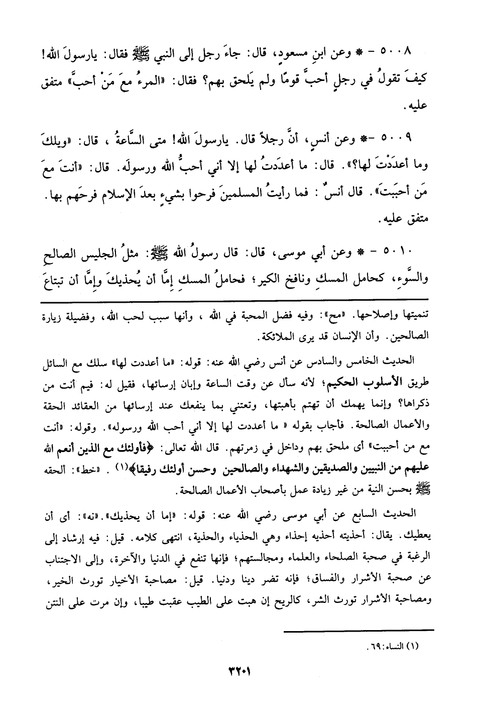 5008 - وعن ابن مسعود، قال: جاء رجل إلى النبي صلى الله عليه وسلم فقال: يا رسول الله! كيف تقول في رجل أحب قوماً ولم يلحق بهم؟ فقال: ((المرء مع من أحب)) متفق عليه.