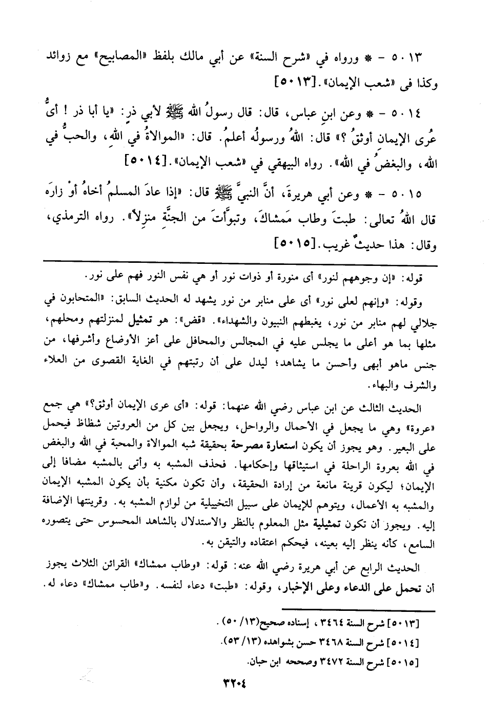 الحديث الثالث عن ابن عباس رضي الله عنهما: قوله: ((أي عرى الإيمان أوثق؟)) هي جمع ((عروة)) وهي ما يجعل في الأحمال والرواحل، ويجعل بين كل من العروتين شظاظ فيحمل على البعير. وهو يجوز أن يكون استعارة مصرحة بحقيقة شبه الموالاة والمحبة في الله والبغض في الله بعروة الراحلة في استيثاقها وإحكامها. فحذف المشبه به وأتى بالمشبه مضافاً إلى الإيمان؛ ليكون قرينة مانعة من إرادة الحقيقة، وأن تكون مكنية بأن يكون المشبه الإيمان والمشبه به الأعمال، ويتوهم للإيمان على سبيل التخييلية من لوازم المشبه به. وقرينتا الإضافة إليه. ويجوز أن تكون تمثيلية مثل المعلوم بالنظر والاستدلال بالشاهد المحسوس حتى يتصوره السامع، كأنه ينظر إليه بعينه، فيحكم اعتقاده والتيقن به.