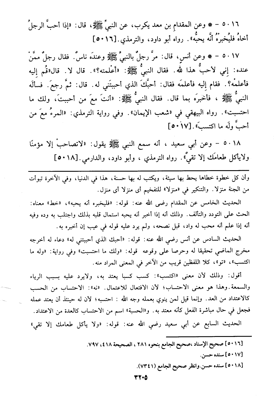 5017 - وعن أنس، قال: مر رجل بالنبي صلى الله عليه وسلم وعنده ناس. فقال رجل ممن عنده: إني لأحب هذا لله. فقال النبي صلى الله عليه وسلم: ((أعلمته؟)). قال لا. قال ((قم إليه فأعلمه؟. فقام إليه فأعلمه فقال: أحبك الذي أحببتني له. قال: ثم رجع. فسأله النبي صلى الله عليه وسلم، فأخبره بما قال. فقال النبي صلى الله عليه وسلم: ((أنت مع من أحببت، ولك ما احتسبت)). رواه البيهقي في ((شعب الإيمان)). وفي رواية الترمذي: ((المرء مع من أحب وله ما اكتسب)). [5017]
