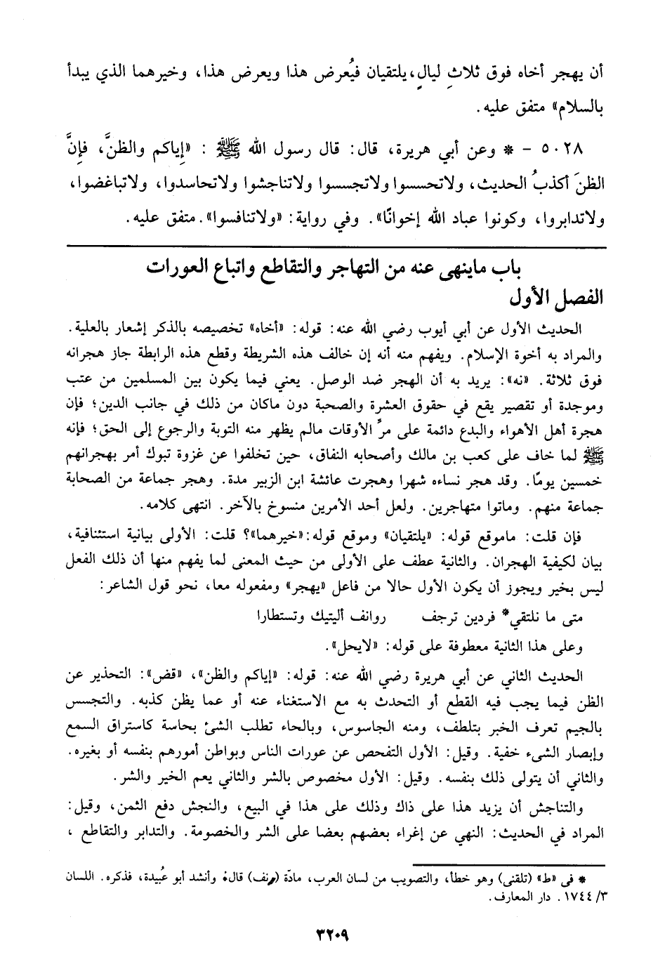 الحديث الأول عن أبي أيوب رضي الله عنه: قوله: ((أخاه)) تخصيصه بالذكر إشعار بالعلية. والمراد به أخوة الإسلام، ويفهم منه أنه إن خالف هذه الشريطة وقطع هذه الرابطة جاز هجرانه فوق ثلاثة. ((نه)): يريد به أن الهجر ضد الوصل. يعني فيما يكون بين المسلمين من عتب وموجدة أو تقصير يقع في حقوق العشرة والصحبة دون ما كان من ذلك في جانب الدين؛ فإن هجرة أهل الأهواء والبدع دائمة على مر الأوقات ما لم يظهر منه التوبة والرجوع إلى الحق؛ فإنه صلى الله عليه وسلم لما خاف على كعب بن مالك وأصحاب النفاق، حين تخلفوا عن غزوة تبوك أمر بهجرانهم خمسين يوماً. وقد هجر نساءه شهراً وهجرت عائشة ابن الزبير مدة. وهجر جماعة من الصحابة جماعة منهم. وماتوا متهاجرين. ولعل أحد الأمرين منسوخ بالآخر. انتهى كلامه.