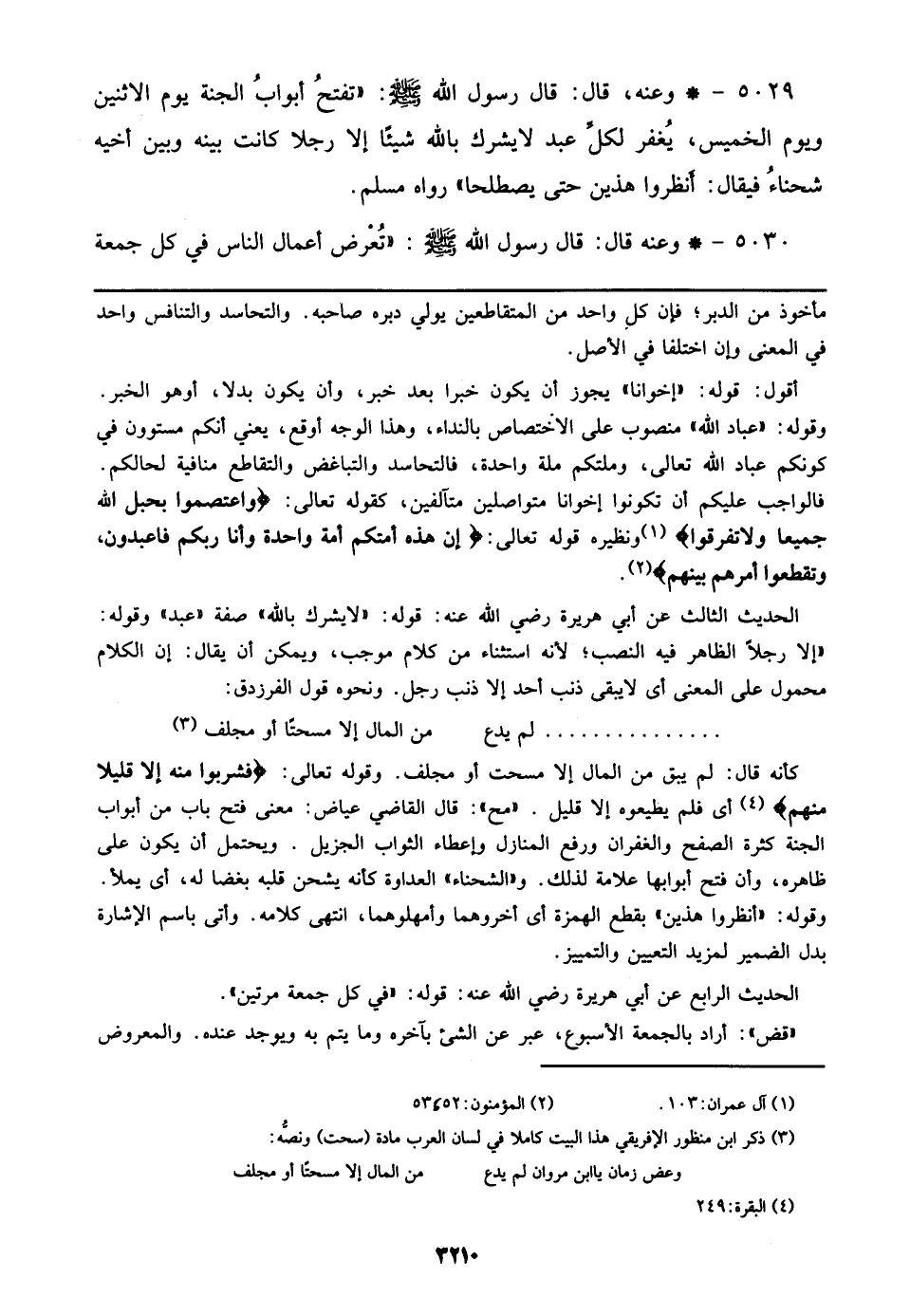 5029 - وعنه، قال: قال رسول الله صلى الله عليه وسلم: ((تفتح أبواب الجنة يوم الاثنين ويوم الخميس، يغفر لكل عبد لا يشرك بالله شيئاً إلا رجلا كانت بينه وبين أخيه شحناء فيقال: أنظروا هذين حتى يصطلحا)) رواه مسلم.