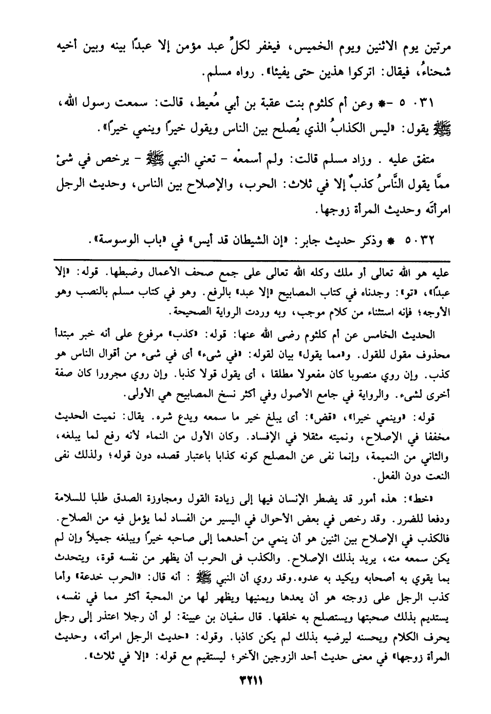 ((خط)): هذه أمور قد يضطر الإنسان فيها إلى زيادة القول ومجاوزة الصدق طلباً للسلامة ودفعاً للضرر. وقد رخص في بعض الأحوال في اليسير من الفساد لما يؤمل فيه من الصلاح. فالكذب في الإصلاح بين اثنين هو أن ينمي من أحدهما إلى صاحبه خيراً ويبلغه جميلاً وإن لم يكن سمعه منه، يريد بذلك الإصلاح. والكذب في الحرب أن يظهر من نفسه قوة، ويتحدث بما يقوي به أصحابه ويكيد به عدوه. وقد روي أن النبي صلى الله عليه وسلم: أنه قال: ((الحرب خدعة)) وأما كذب الرجل على زوجته هو أن يعدها ويمنيها ويظهر لها من المحبة أكثر مما في نفسه، يستديم بذلك صحبتها ويستصلح به خلقها. قال سفيان بن عيينة: لو أن رجلا اعتذر إلى رجل يحرف الكلام ويحسنه ليرضيه بذلك لم يكن كاذباً. وقوله: ((حديث الرجل امرأته، وحديث المرأة زوجها)) في معنى حديث أحد الزوجين الآخر؛ ليستقيم مع قوله: ((إلا في ثلاث)).