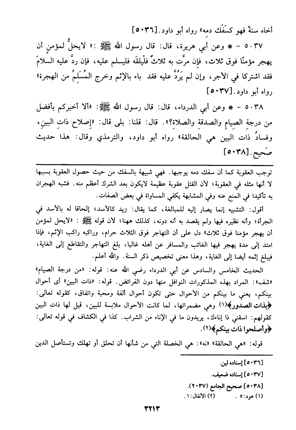 5037 - وعن أبي هريرة، قال: قال رسول الله صلى الله عليه وسلم: ((لا يحل لمؤمن أن يهجر مؤمنا فوق ثلاث، فإن مرت به ثلاث فليلقه فليسلم عليه، فإن رد عليه السلام فقد اشتركا في الأجر، وإن لم يرد عليه فقد باء بالإثم وخرج المسلم من الهجرة)) رواه أبو داود. [5037]