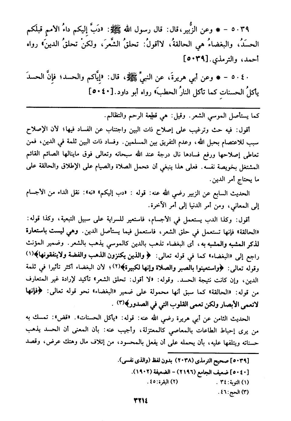 5039 - وعن الزبير، قال: قال رسول الله صلى الله عليه وسلم: ((دب إليكم داء الأمم قبلكم الحسد، والبغضاء هي الحالقة، لا أقول: تحلق الشعر، ولكن تحلق الدين)) رواه أحمد، والترمذي. [5039]