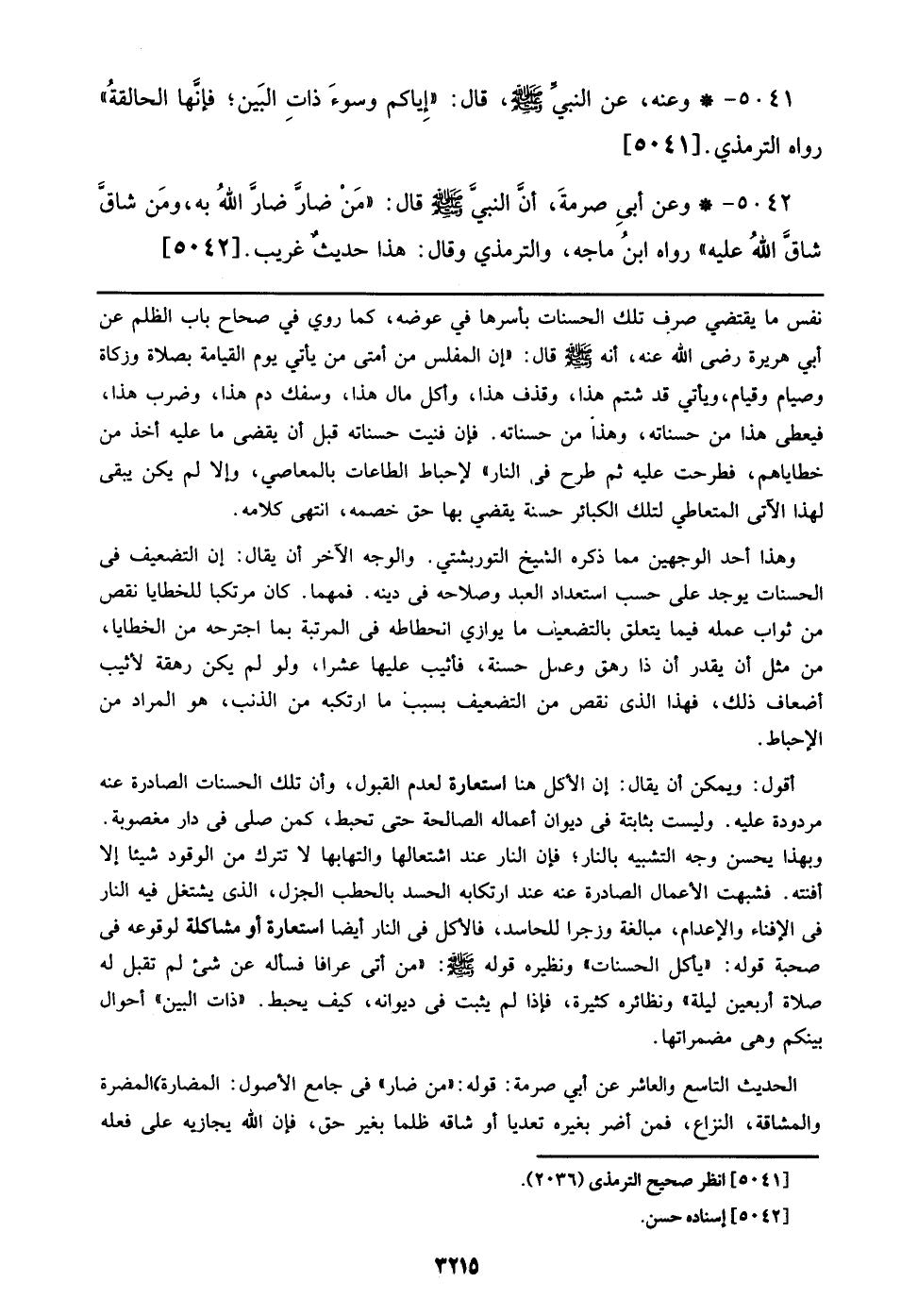الحديث التاسع والعاشر عن أبي صرمة: قوله: ((من ضار)) في جامع الأصول: المضارة، المضرة والمشاقة، والنزاع، فمن أضر بغيره تعديا أو شاقه ظلما بغير حق، فإن الله يجازيه على فعله