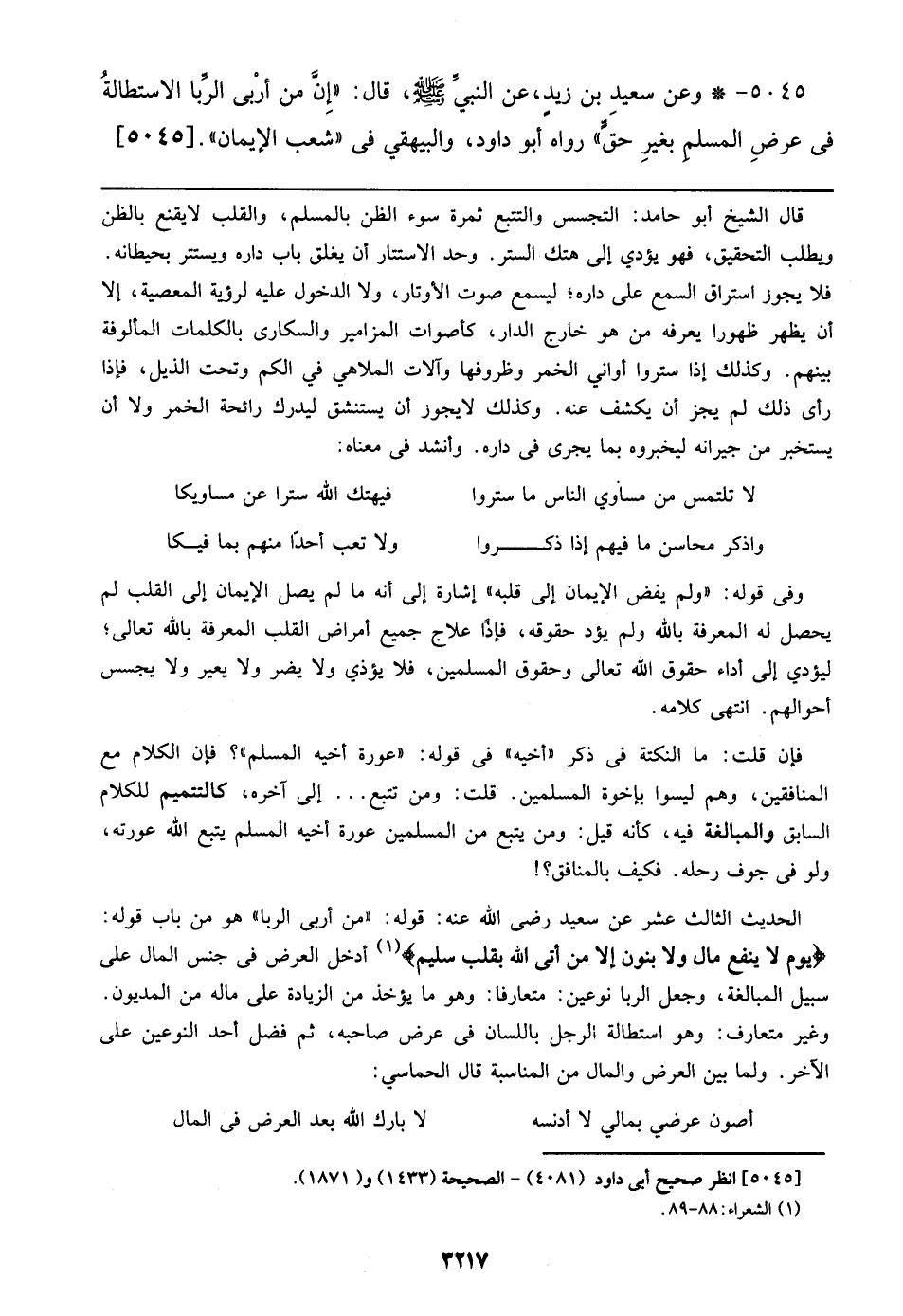 الحديث الثالث عشر عن سعيد رضي الله عنه: قوله: ((من أربى الربا)) هو من باب قوله: {يوم لا ينفع مال ولا بنون إلا من أتى الله بقلب سليم} أدخل العرض في جنس المال على سبيل المبالغة، وجعل الربا نوعين: متعارفين: وهو ما يؤخذ من الزيادة على ماله من المديون. وغير متعارف: هو استطالة الرجل باللسان في عرض صاحبه، ثم فضل أحد النوعين على الآخر. ولما بين العرض والمال من المناسبة قال الحماسي: