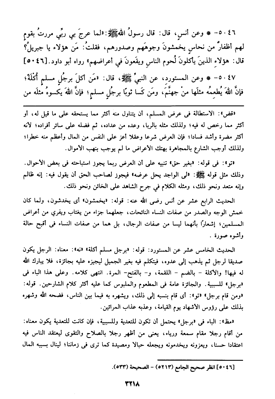 الحديث الرابع عشر عن أنس رضي الله عنه: قوله: ((يخمشون)) أي يخدشون، ولما كان خمش الوجه والصدر من صفات النساء النائحات، جعلهما جزاء من يغتاب ويفري من أغراض المسلمين؛ إشعاراً بأنهما ليسا من صفات الرجال، بل هما من صفات النساء في أقبح حالة وأشوه صورة.