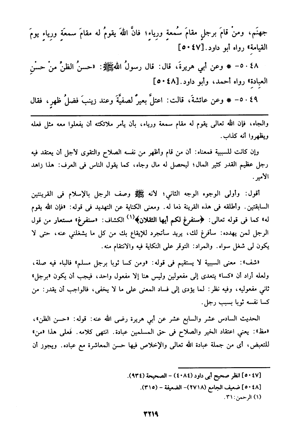 جهنم، ومن قام برجل مقام سمعة ورياء؛ فإن الله يقوم له مقام سمعة ورياء يوم القيامة)) رواه أبو داود. [5047]